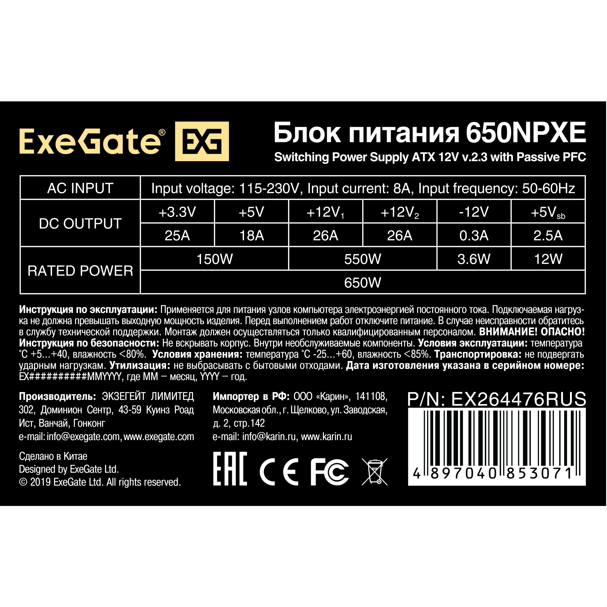 Блок питания 650W ExeGate 650NPXE (ATX, PPFC, 12cm fan, 24pin, 2x(4+4)pin, PCIe, 4xSATA, 3xIDE, black) (деф. корпуса)