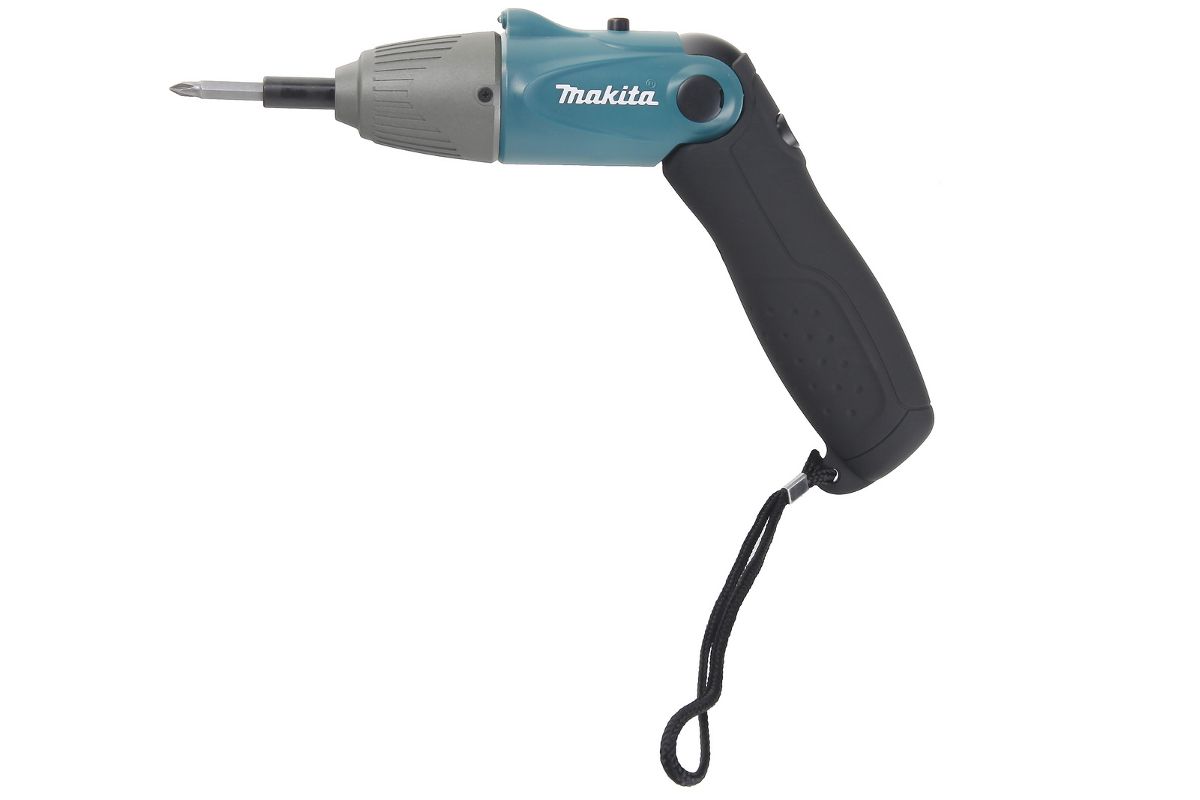 В стесненных условиях можно изменять форму рукоятки инструмента за счет шарнирного соединения рукоятки и корпуса: ручка может быть прямой, а может принимать форму пистолета. Обрезиненная рукоять и шнурок для переноски шуруповерта облегчают частую эксплуатацию отвертки MAKITA 6723DW. К неоспоримым преимуществам данной модели относится малый вес инструмента – всего 0,42 кг, что значительно снижает утомляемость оператора.