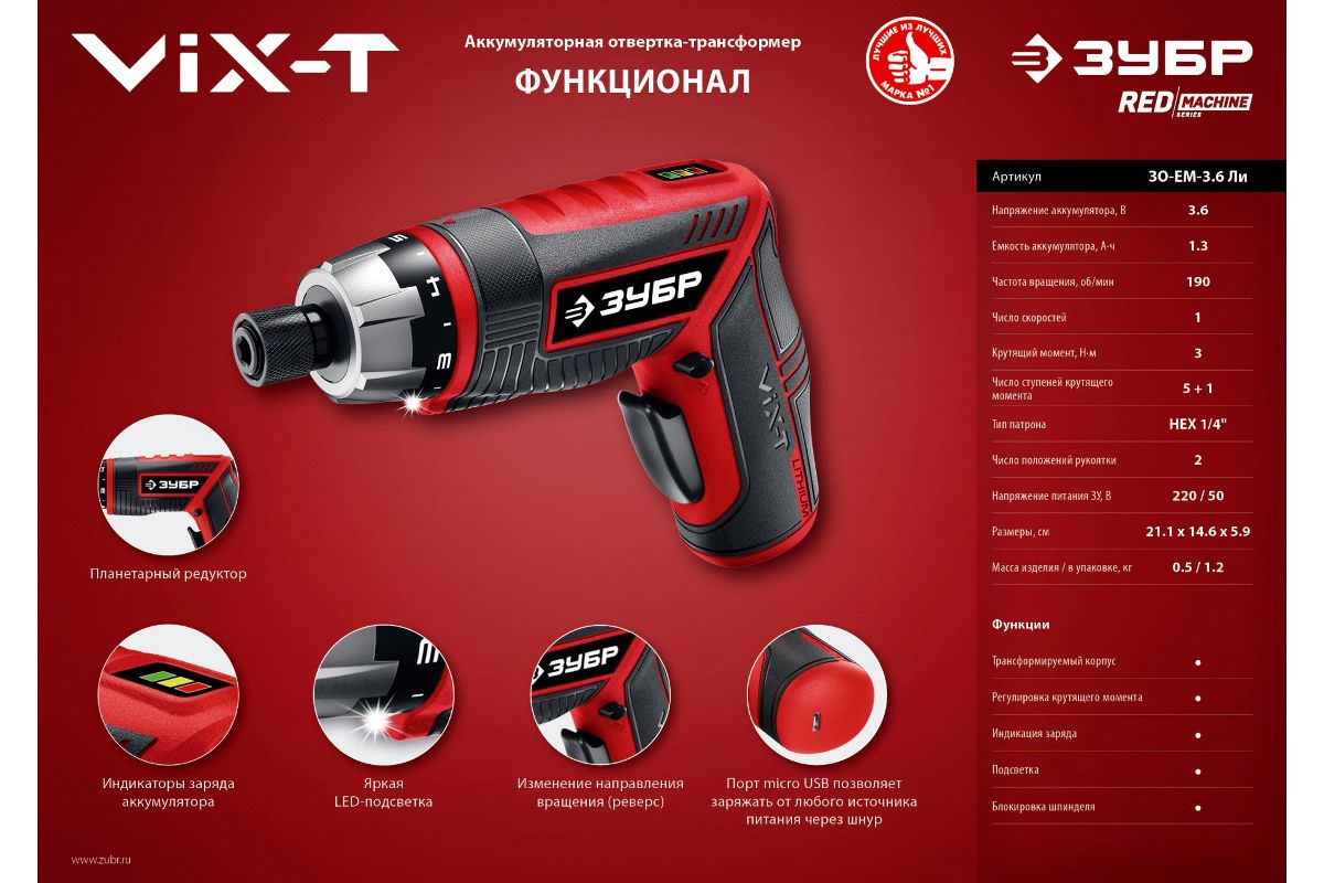 Отвертка аккумуляторная ЗУБР ViX-T ЗО-ЕМ-3.6 Ли