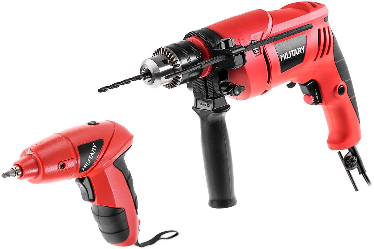 В состав набора входят: Аккум.отвертка MILITARY SD4.8 4.8В 0.6Ач NiCd 180об/мин 2.5Нм в коробке, Дрель ударная MILITARY HD600 600Вт 0-3000 об/мин 13мм реверс