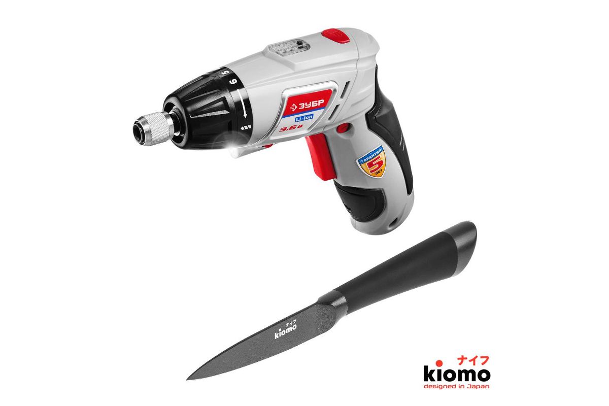 Набор: Отвертка аккумуляторная ЗУБР ЗО-3.6-Ли КН43+Нож для очистки овощей KIOMO 32-15