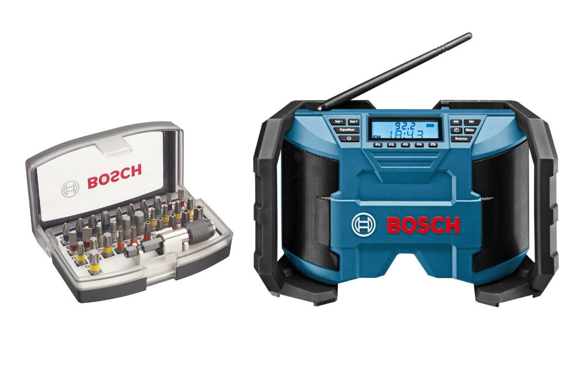 В состав набора входят: Радио BOSCH GML 12 V-LI (0.601.429.200) 12В LI-ION 2х5Вт, Набор бит BOSCH 2.607.017.319 1/4'' 25мм 32шт без акк. и З.У.