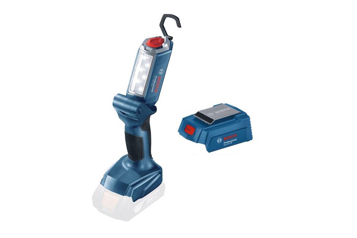 В состав набора входят: Фонарь BOSCH GLI 18V-300 (0.601.4A1.100) 6 мощных светодиодов нет АКБ и ЗУ, Адаптер BOSCH GAA 18V-24 USBx2 (2x2.4A или 2 x 1.2A) Порт для куртки с подогревом