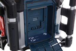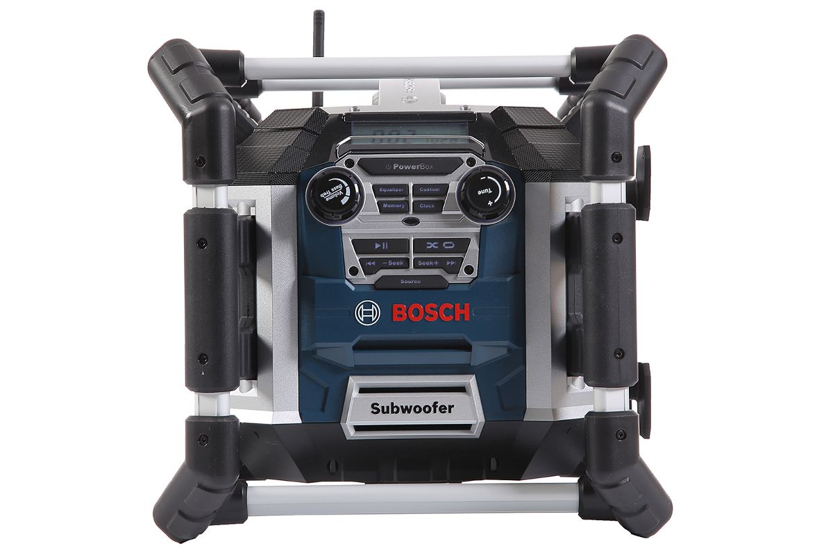 Радио BOSCH GML 50 POWER BOX — это первое в мире строительное радио со встроенным сабвуфером. Конечно, музыка просто необходима в сложных условиях строительной площадки, но создатели этого радио постарались еще больше расширить его функционал. В корпусе модели есть отсек для подзарядки литий-ионных аккумуляторов с напряжением 14,4-18 В, две розетки на 230 В для подключения других электроинструментов, выход на 12 В для зарядки мобильного телефона или плеера.