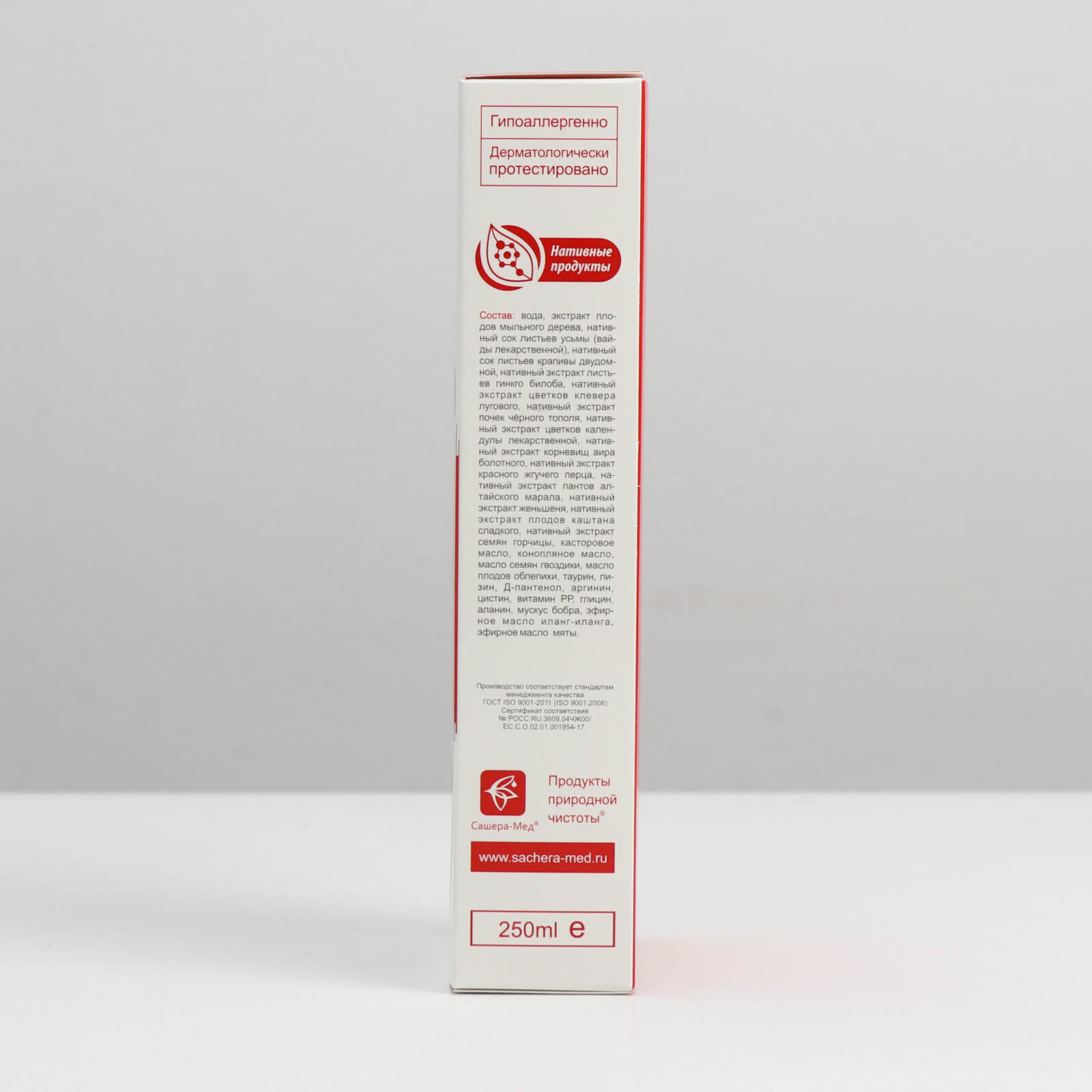 Состав: вода, экстракт плодов мыльного дерева, нативный сок листьев вайды лекарственной (усьмы), нативный сок листьев крапивы двудомной, нативный экстракт листьев гинкго билоба, нативный экстракт цветков клевера лугового, нативный экстракт почек чёрного тополя, нативный экстракт цветков календулы лекарственной, нативный экстракт корневищ аира болотного, нативный экстракт красного жгучего перца, нативный экстракт пантов алтайского марала, нативный экстракт женьшеня, нативный экстракт плодов каштана сладкого, нативный экстракт семян горчицы, касторовое масло, конопляное масло, масло семян гвоздики, масло плодов облепихи, таурин, лизин, Д-пантенол, аргинин, цистин, витамин РР, глицин, аланин, мускус бобра, эфирное масло иланг-иланг, эфирное масло мяты.
