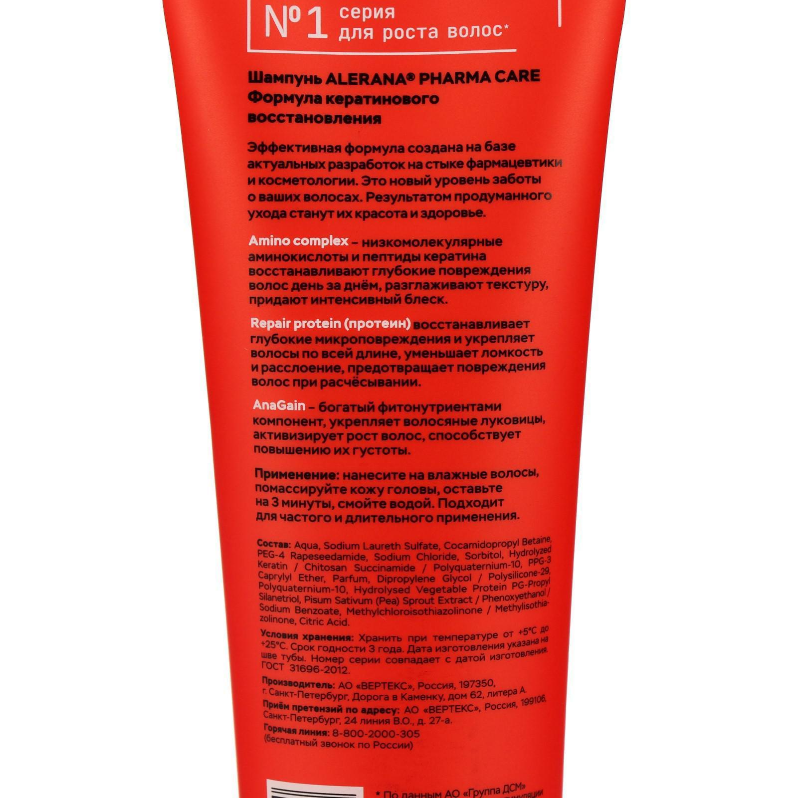 Шампунь для волос Alerana Pharma Care, формула кератинового восстановления, 260 мл