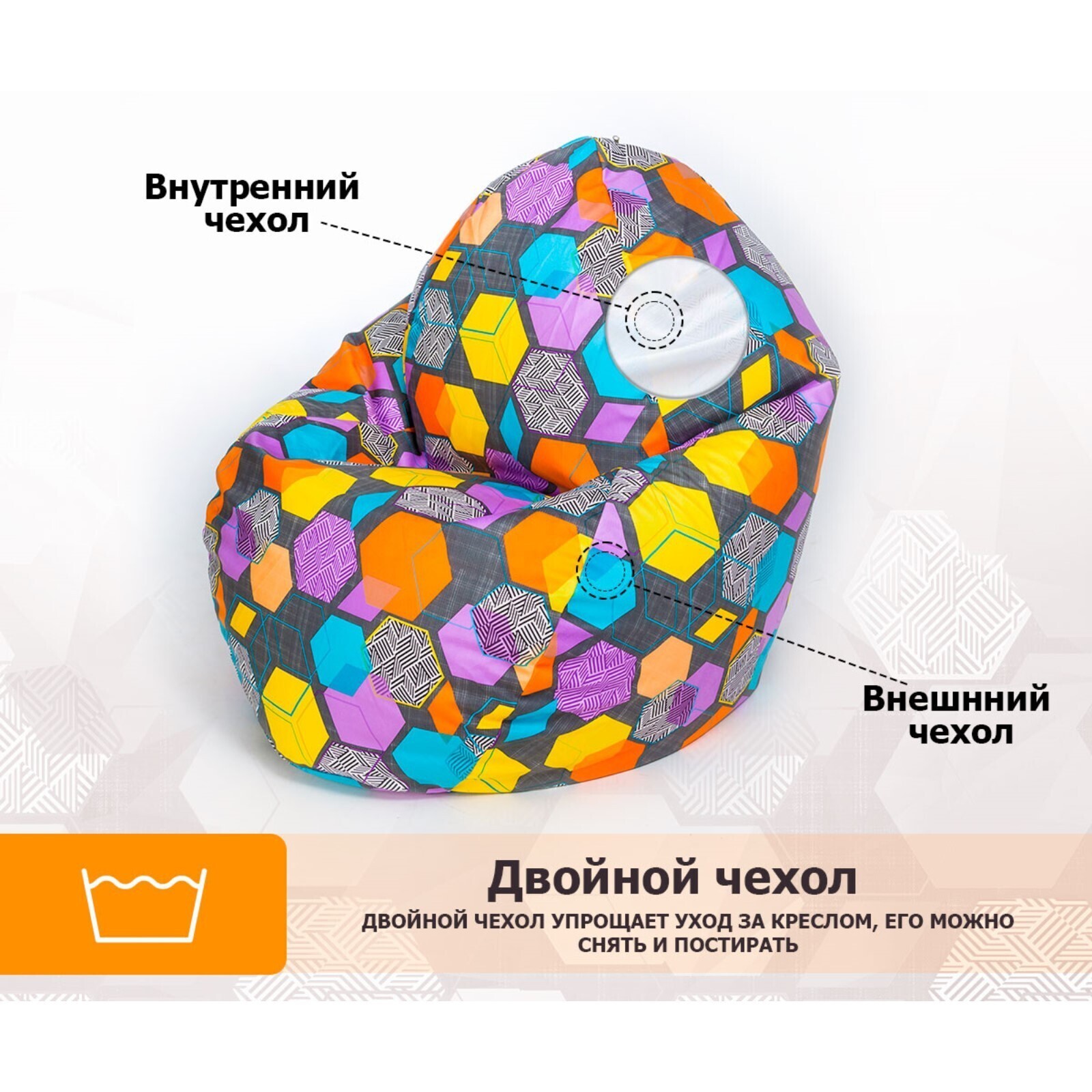 Верх изделия оснащён молнией, при помощи которой чехол снимается для влажной уборки пятен. Внутренний чехол выполнен из плотной нетканной ткани с клапаном для донасыпки наполнителя. Есть удобная ручка для переноски изделия.