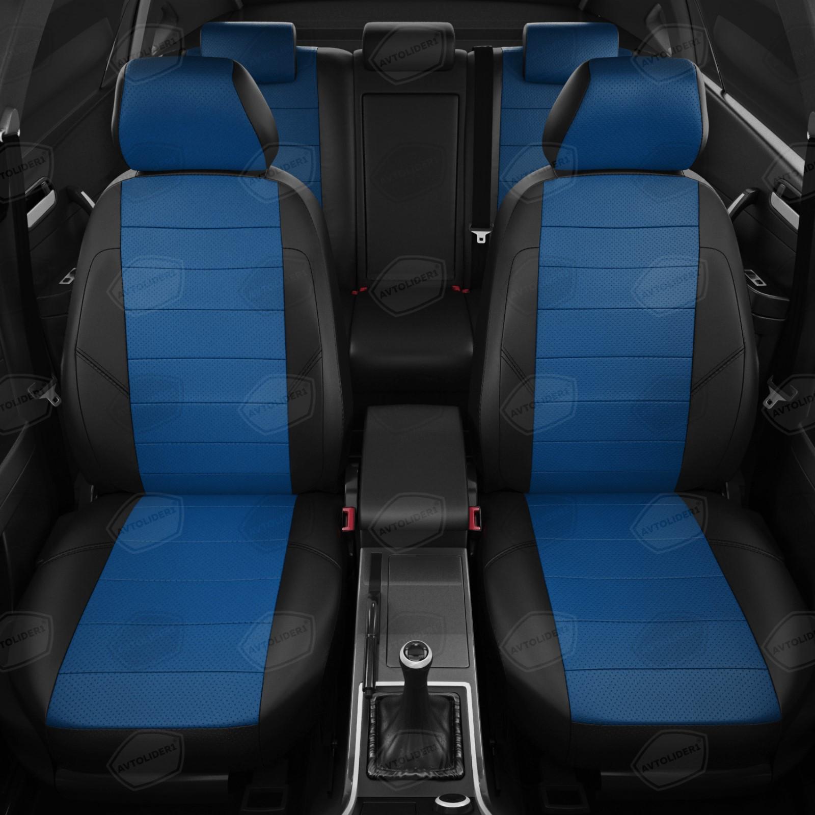 Середина: экокожа синяя с перфорацией. Боковины: чёрная экокожа. Спинка: чёрная экокожа.