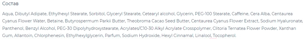 - Активные ингредиенты гиалуроновая кислота, кофеин, экстракт василька, гидролат василька