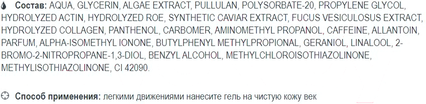 - Активные ингредиенты коллаген, кофеин, пантенол, аллантоин, эластин, экстракт икры (черной)