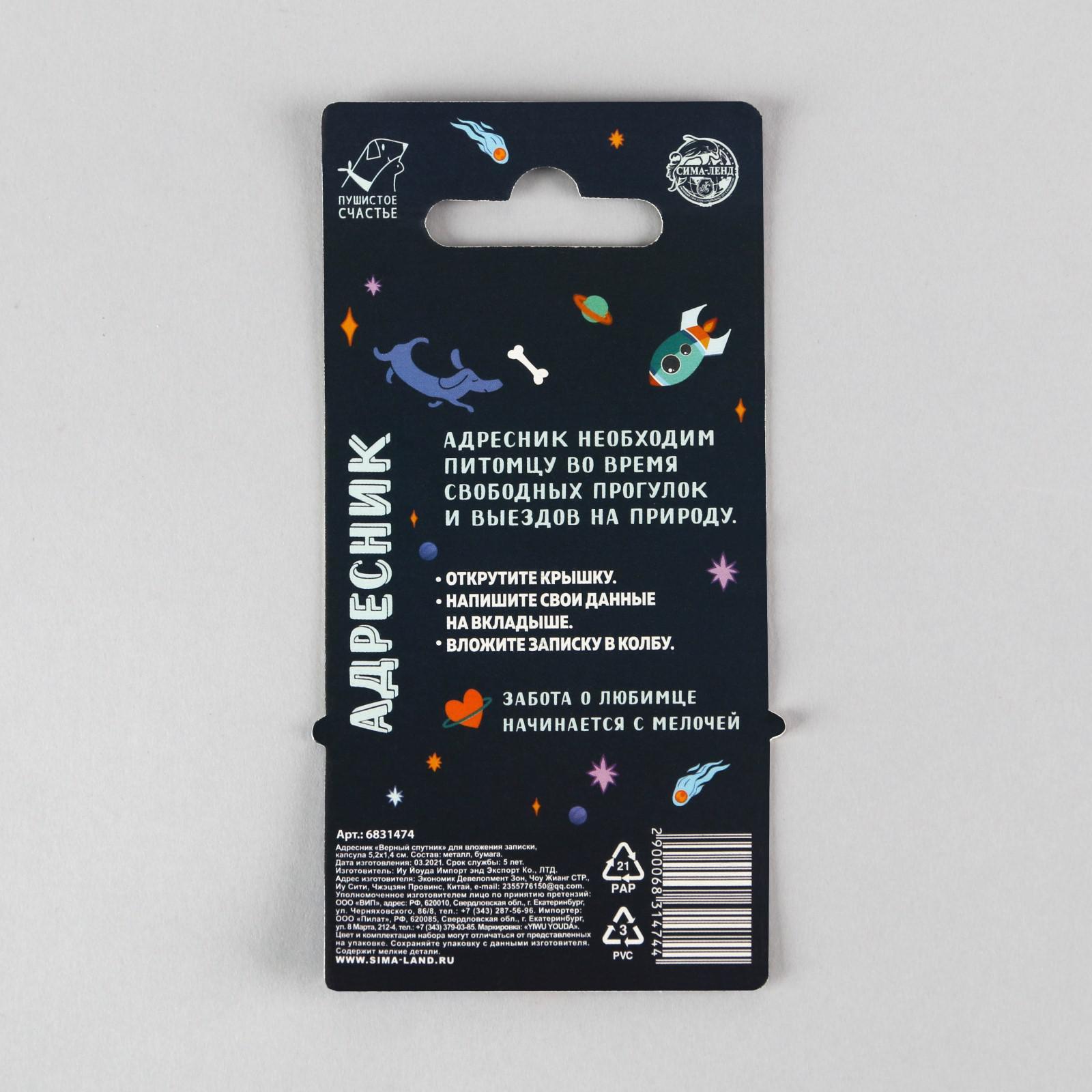 Адресник «Верный спутник» для вложения записки, капсула 5.2х1.4 см