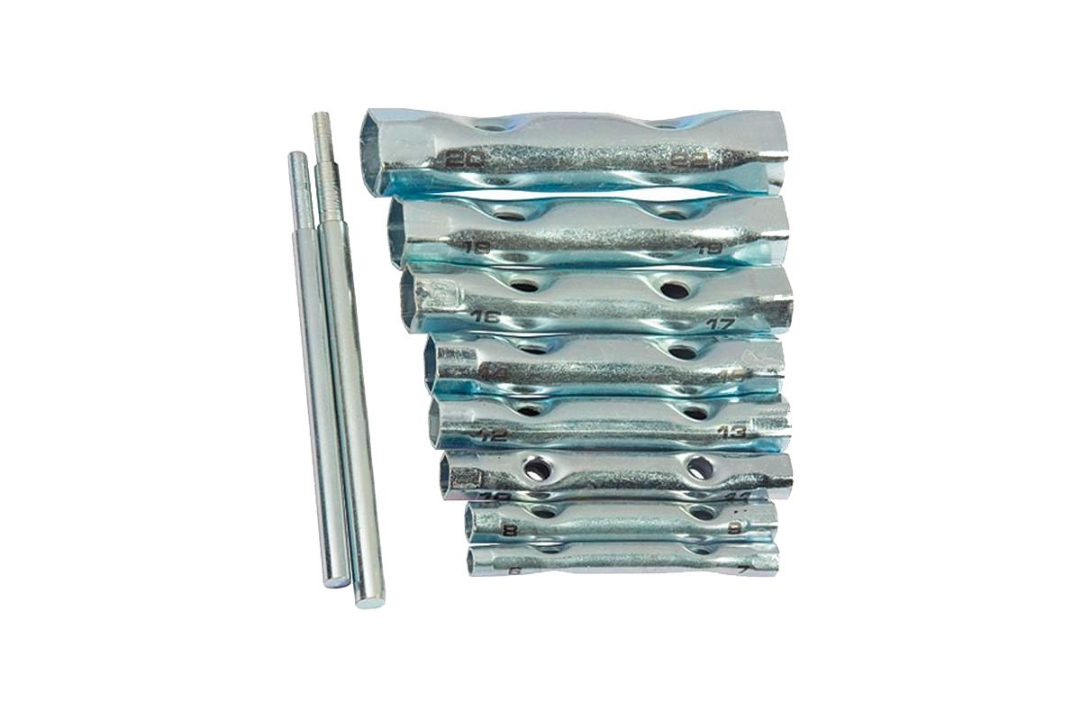 Ключи торцевые двусторонние. Тонкие стенки ключей-трубок позволяют осуществлять монтаж в труднодоступных местах, когда болтовые соединения размещены в значительных углублениях. В набор арт. 13752 входит 8 ключей (6–22 мм) и 2 воротка. В набор арт. 13740 входит 5 ключей (8–17 мм) и 1 вороток. Изготовлены из углеродистой стали. Твердость материала рабочей части ключа – 41 HRc, что соответствует требованиям ГОСТа. Ключи имеют защитное покрытие из цинка. Набор упакован в блистер.