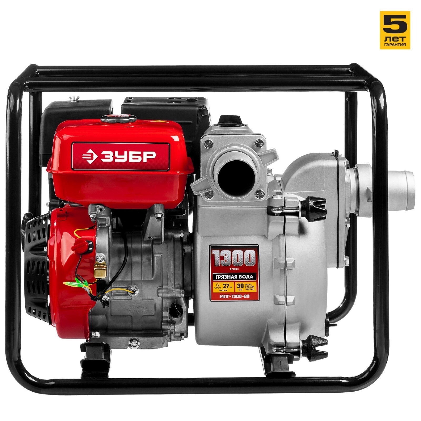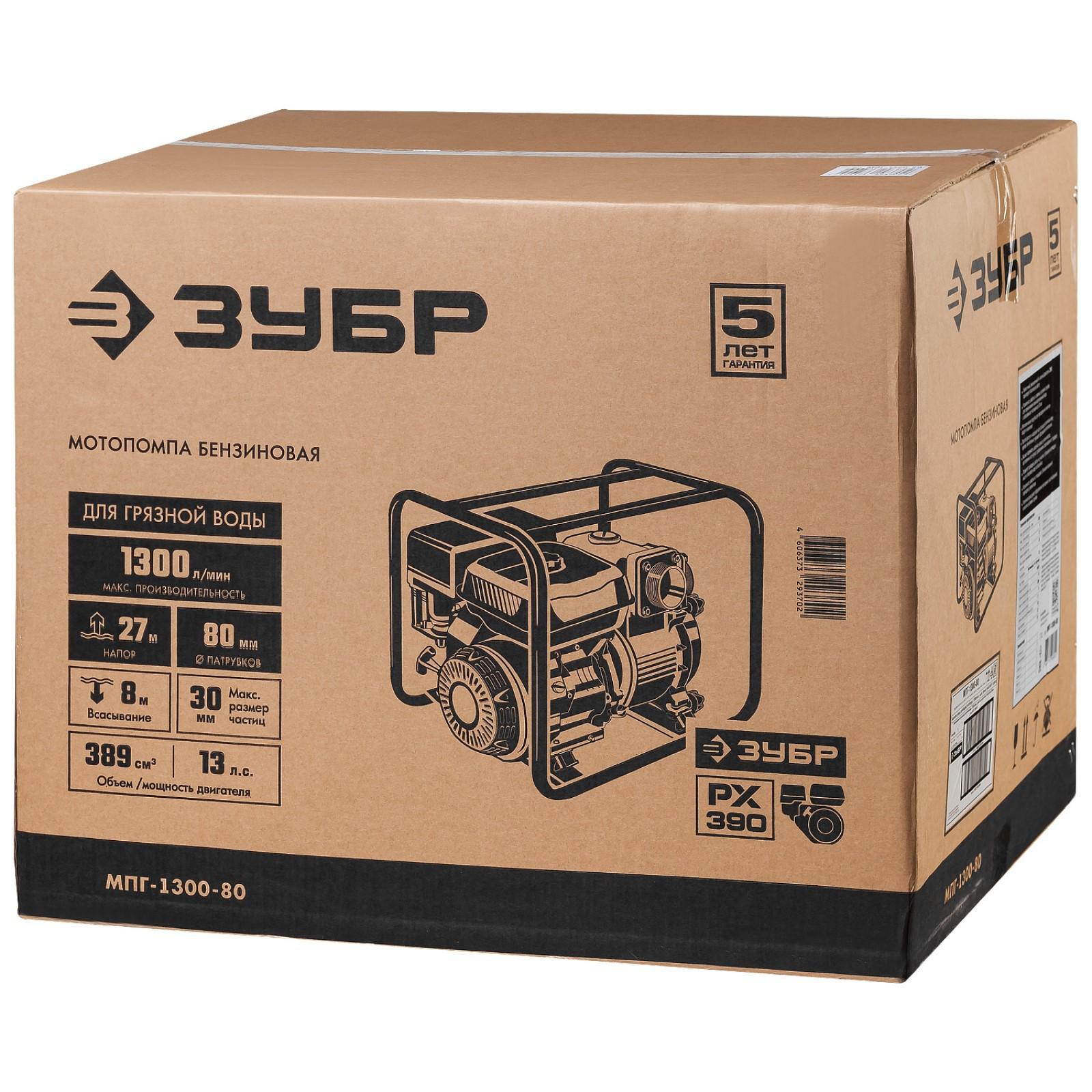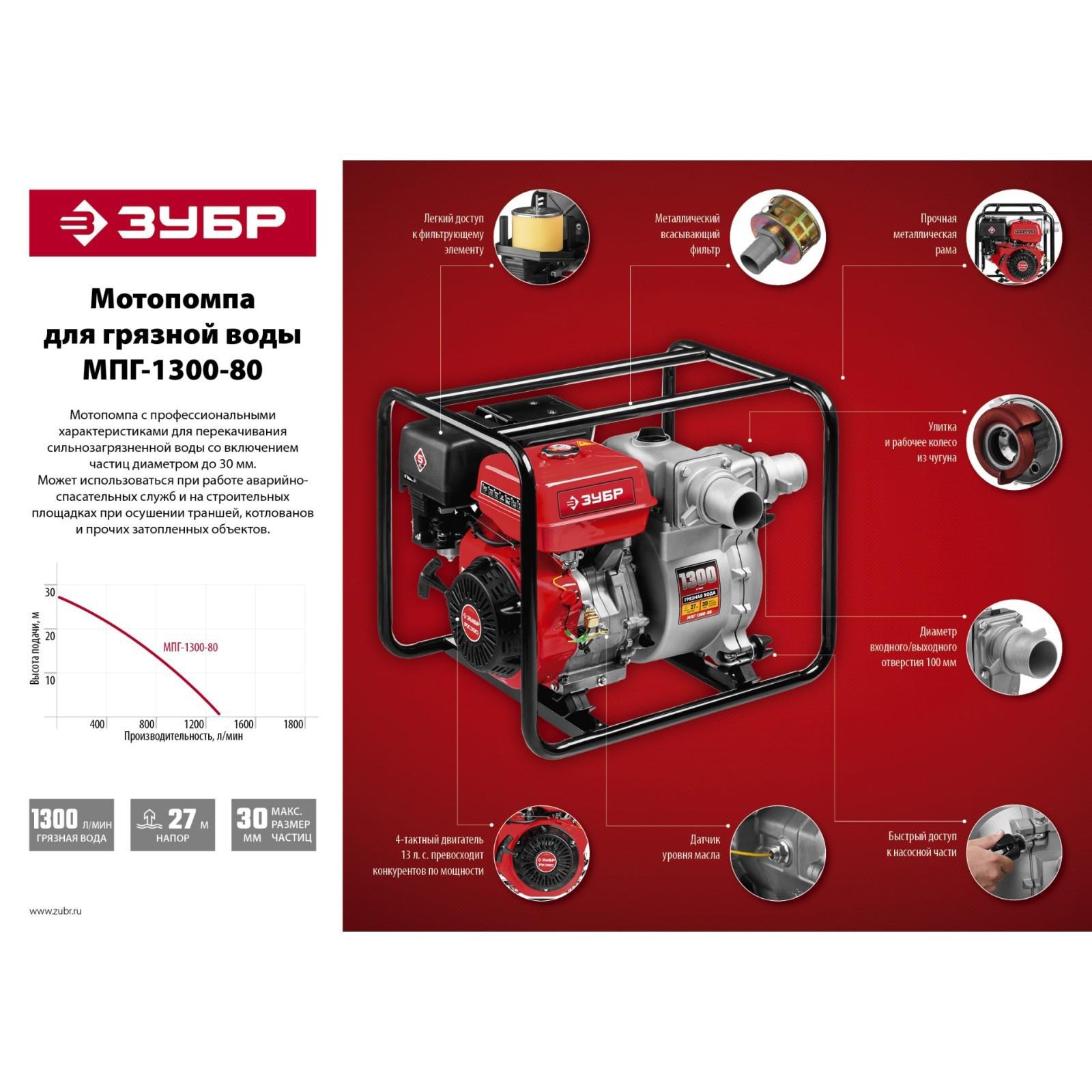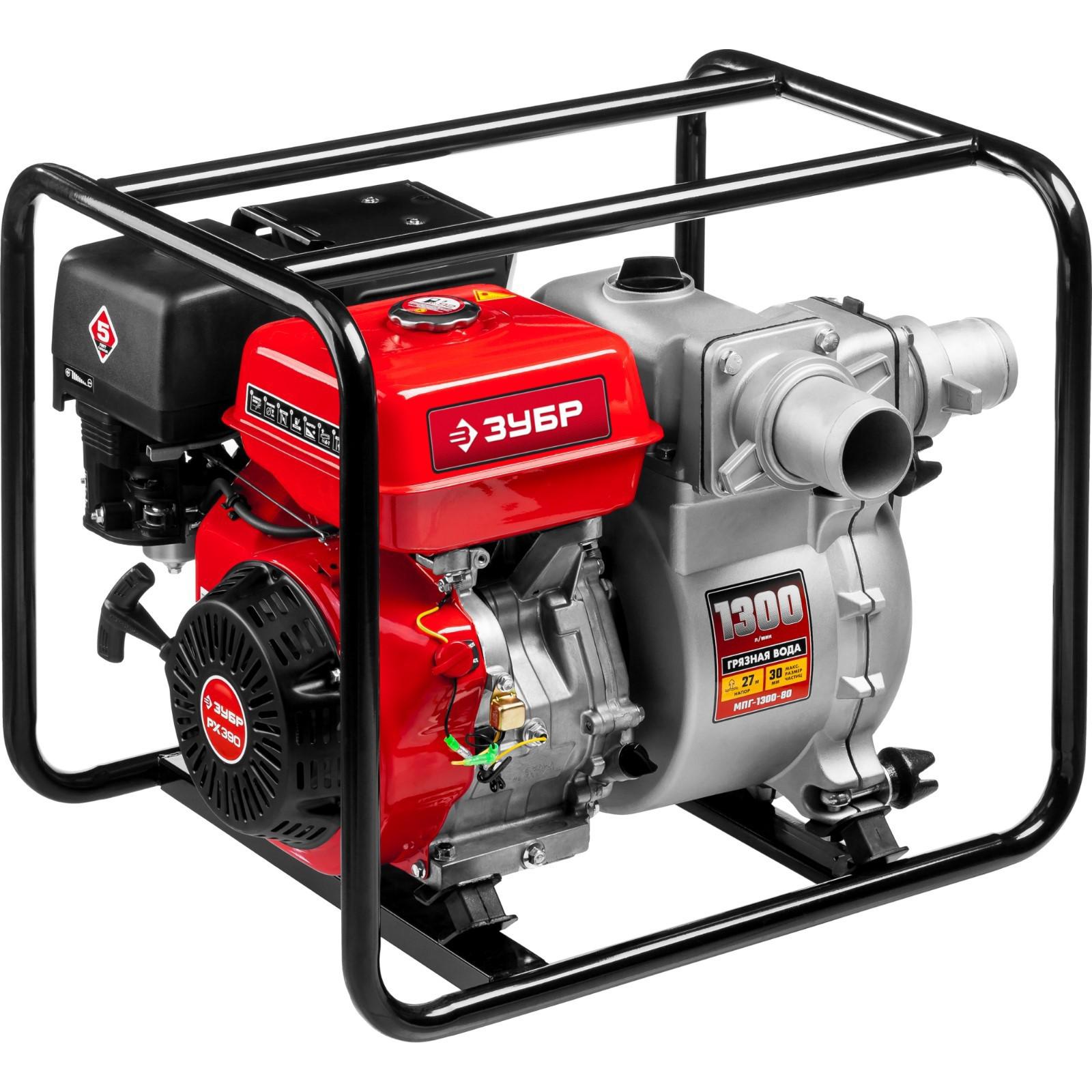 Мотопомпа для грязной воды ЗУБР МПГ-1300-80, 4Т, 9.6 кВт, 1300 л/мин, d=80 мм, подъем 27 м