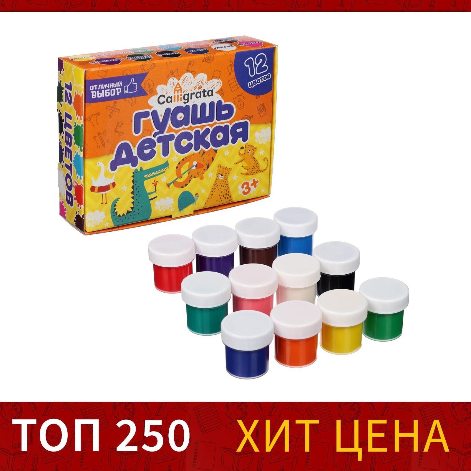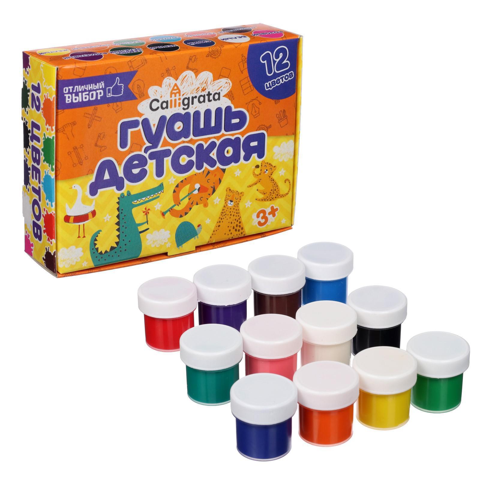 Гуашь для рисования Calligrata серии ""Отличный выбор"" предназначена для творческих занятий в школе и дома. Краска производится на основе качественного прозрачного связующего вещества, обеспечивающего чистоту цвета. Плотная, укрывистая текстура красок хорошо смешивается, равномерно наносится практически на любую основу. При высыхании дает бархатистый матовый эффект. Безопасны для детей, нетоксичны. В наборе 12 баночек разных цветов. Объём каждой баночки - 10 мл. Цветовая палитра гуаши Calligrata состоит из классических оттенков.