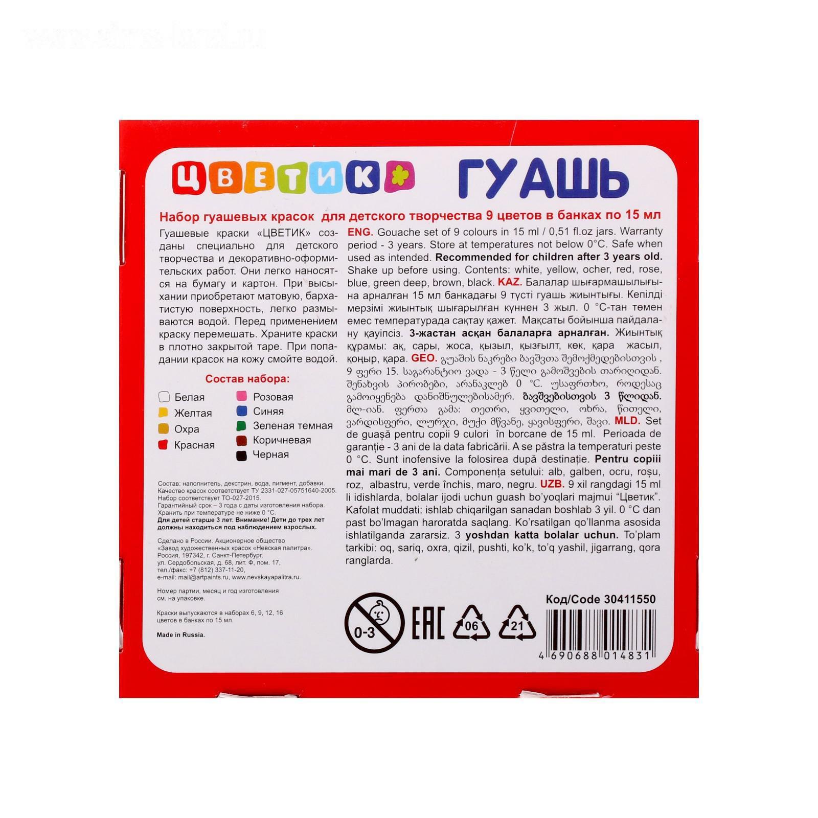 Гуашь 9 цветов 15 мл, ЗХК "Цветик" (30411550)
