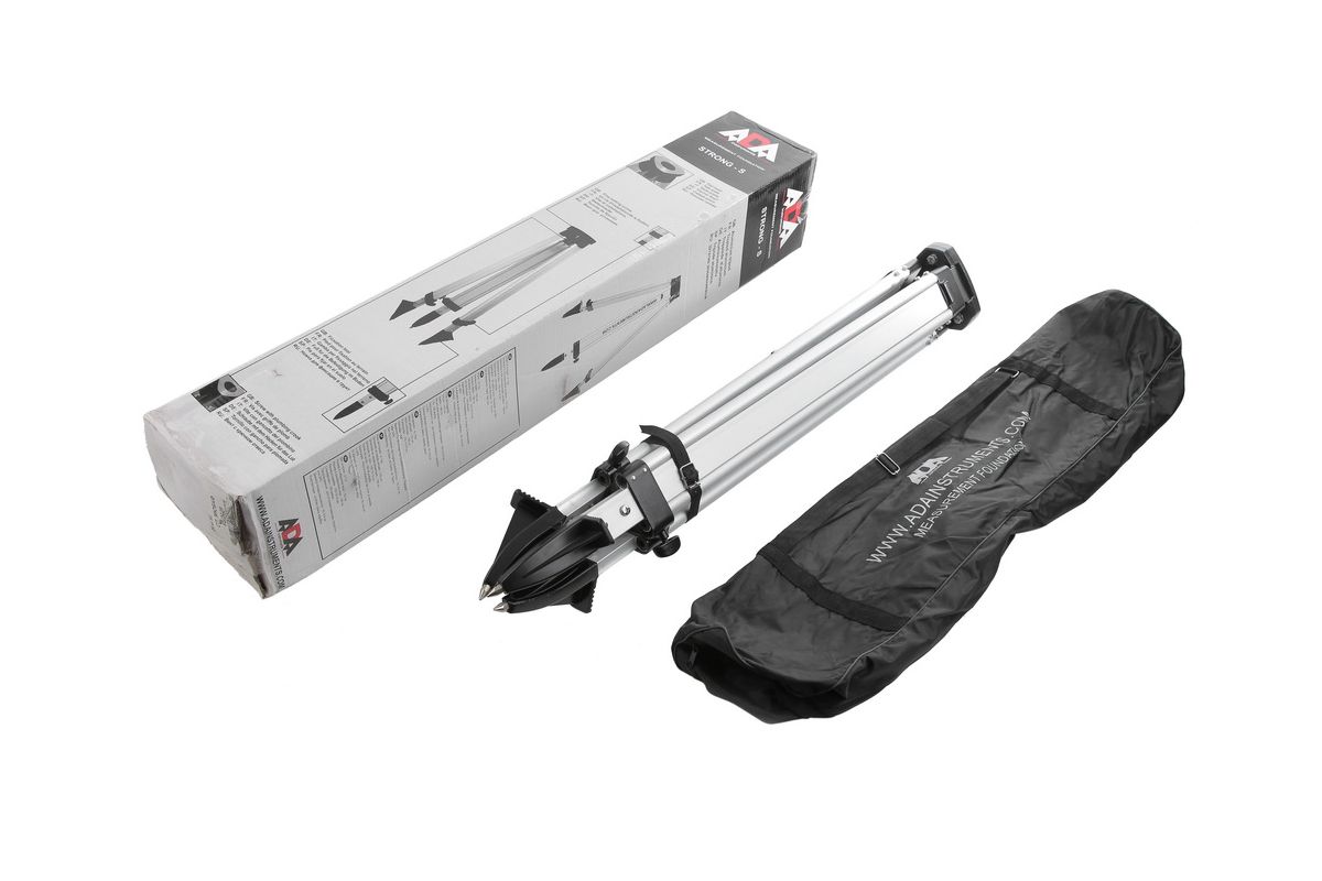 ADA Strong S – штатив для нивелиров, тахеометров и оптических теодолитов весом до 3 кг. Размер резьбы – 5/8”, диаметр посадочной площадки – 125 мм. Корпус весит 5,1 кг. Поставляется в кейсе.