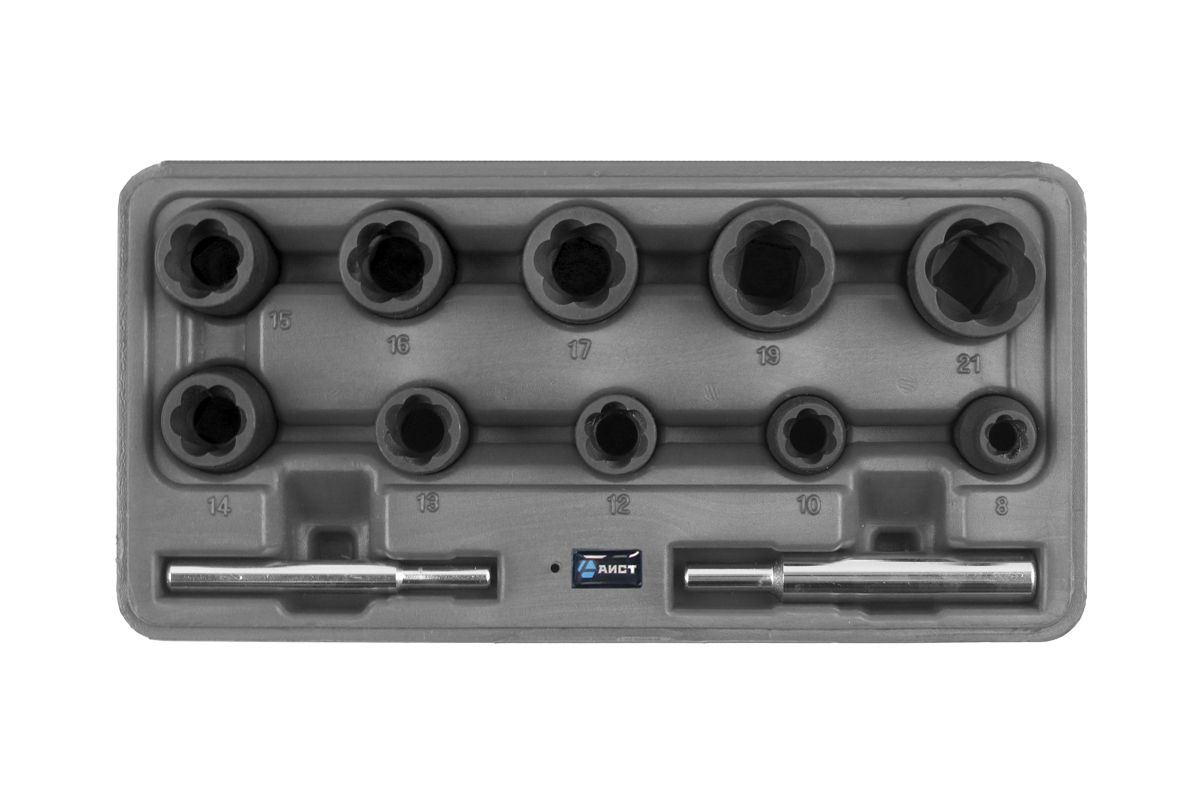 Набор головок для для скругленного крепежа и секреток включает 10 экстракторов следующих размеров: 8, 10, 12, 13, 14, 15, 16, 17, 19, 21мм.