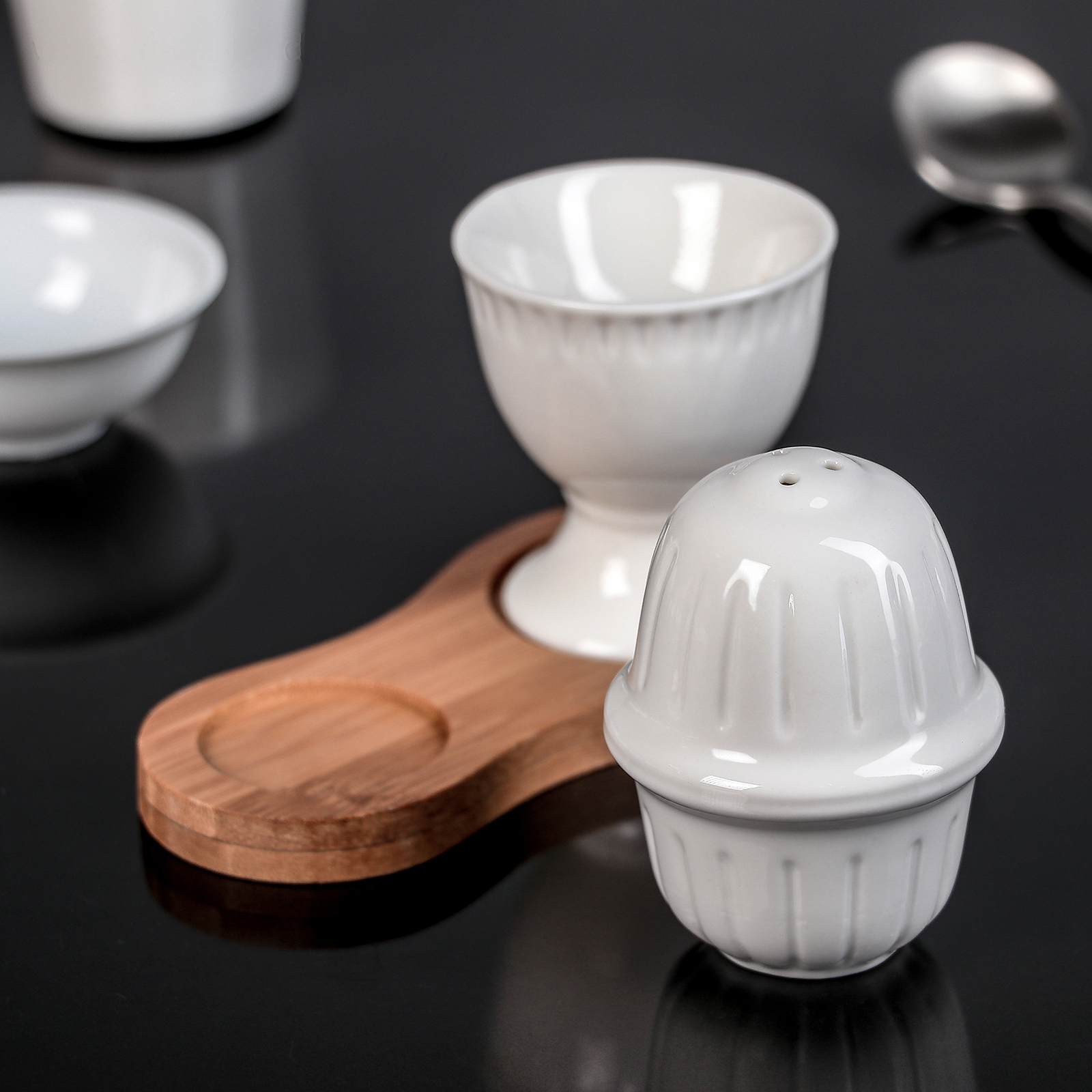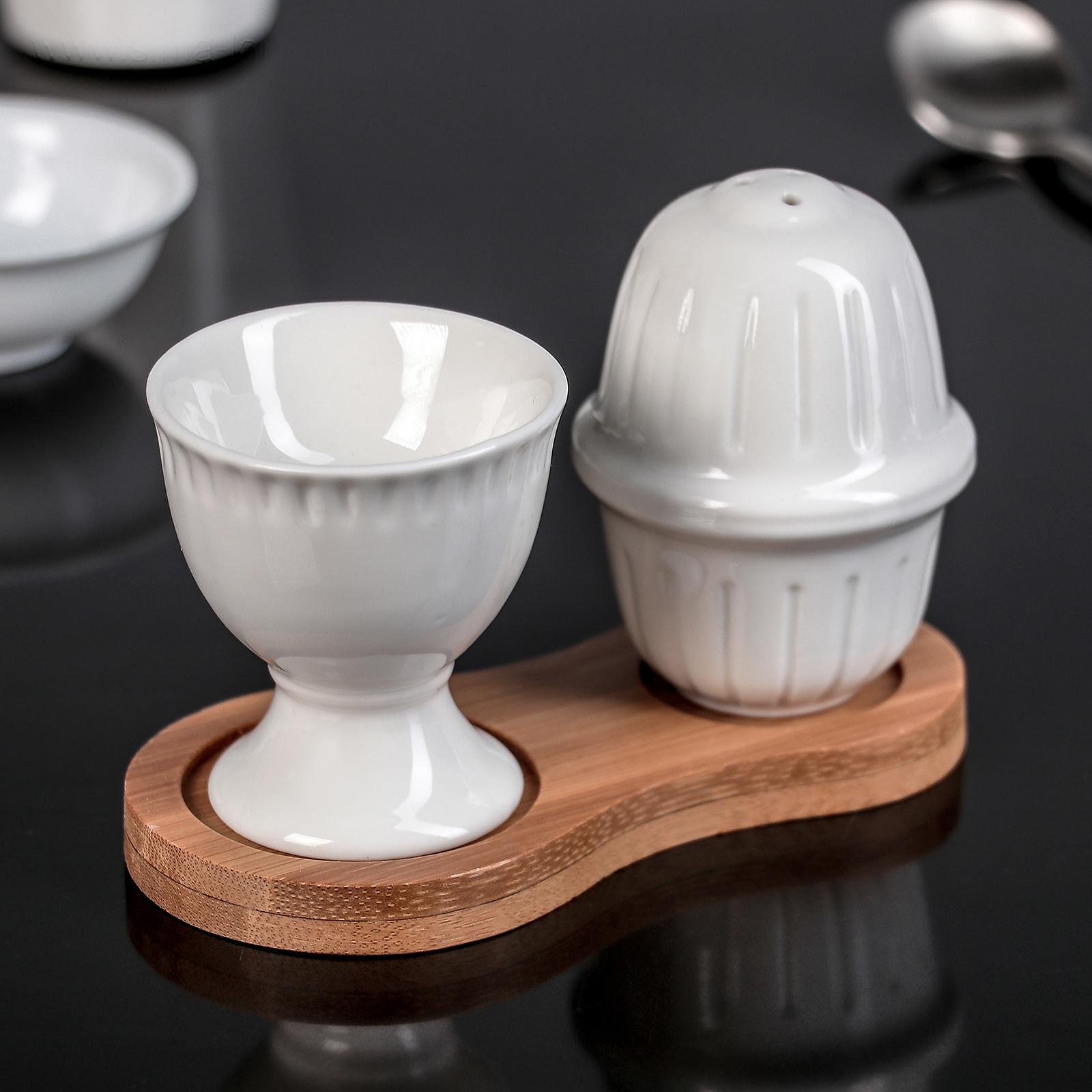 Сервировочный набор Доляна «Эстет» изготовлен из качественного фарфора. Такая посуда отличается высокой прочностью, устойчива к появлению царапин и резким перепадам температур. Подставка для яйца и солонка в классическом стиле дополнены подставкой из бамбука. Набор прекрасно впишется в интерьер кухни, а также подойдёт в качестве подарка.