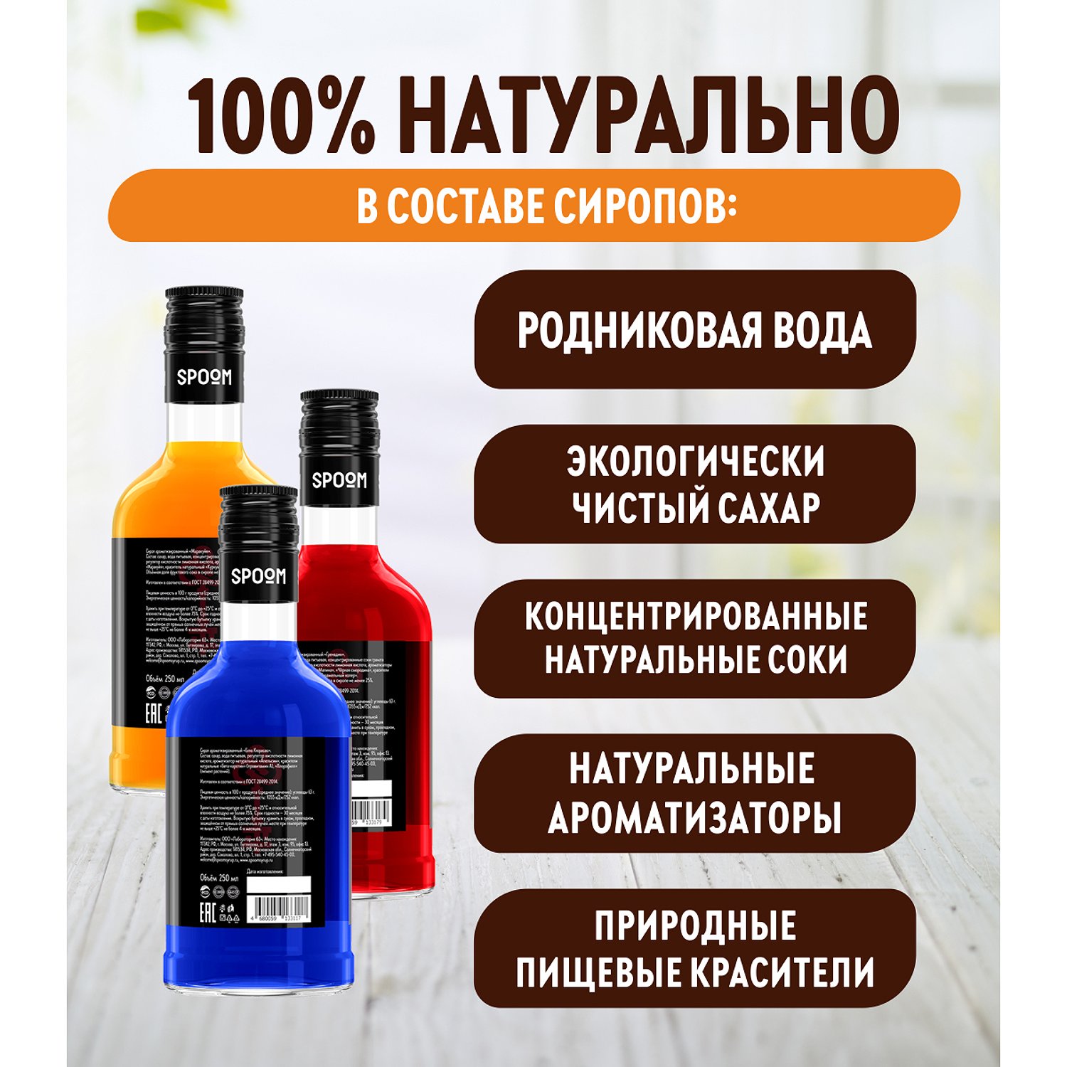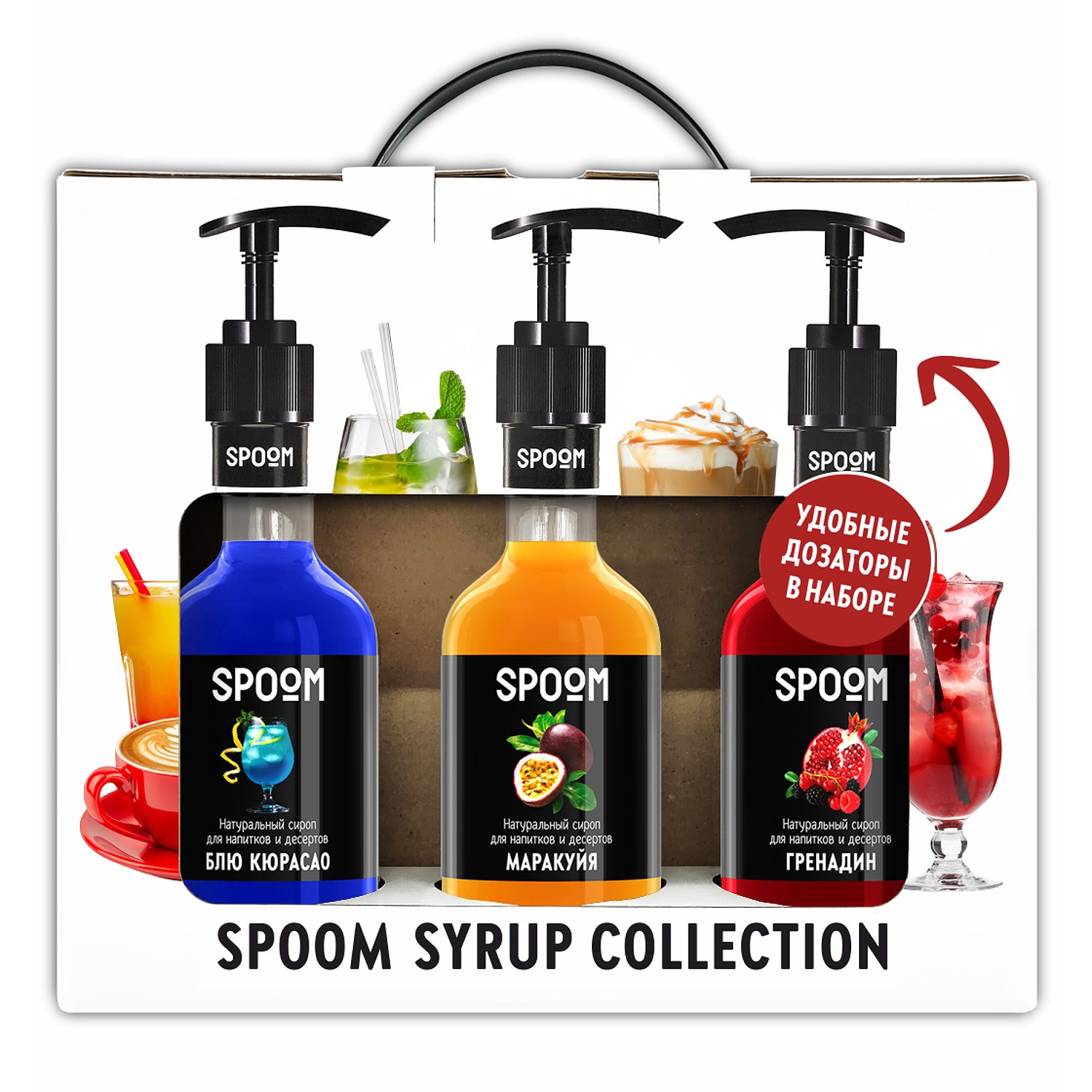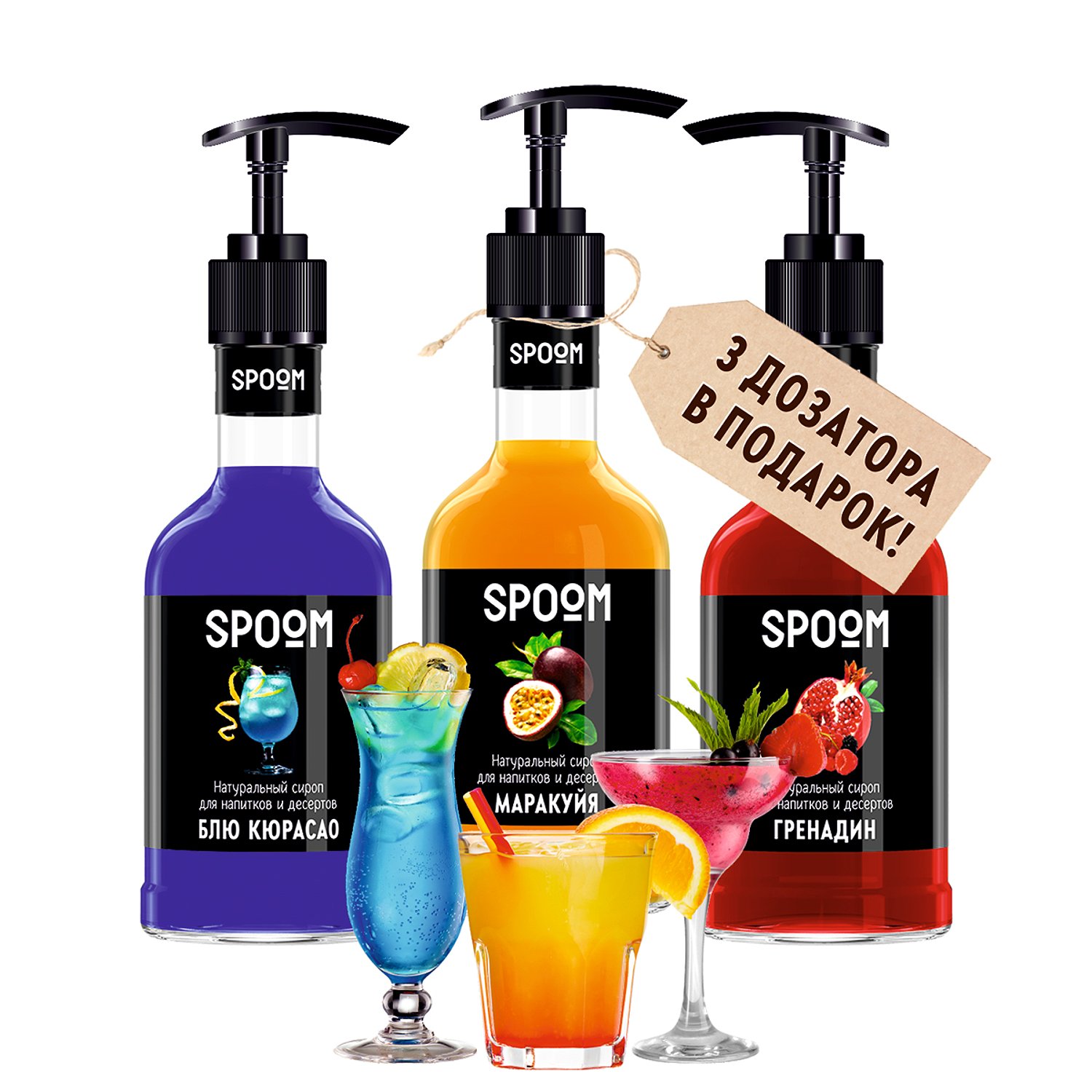 Набор сиропов SPOOM для коктейлей Блю кюрасао Гренадин Маракуйя 3шт 250мл + 3 дозатора в подарок LAB-02-BGM