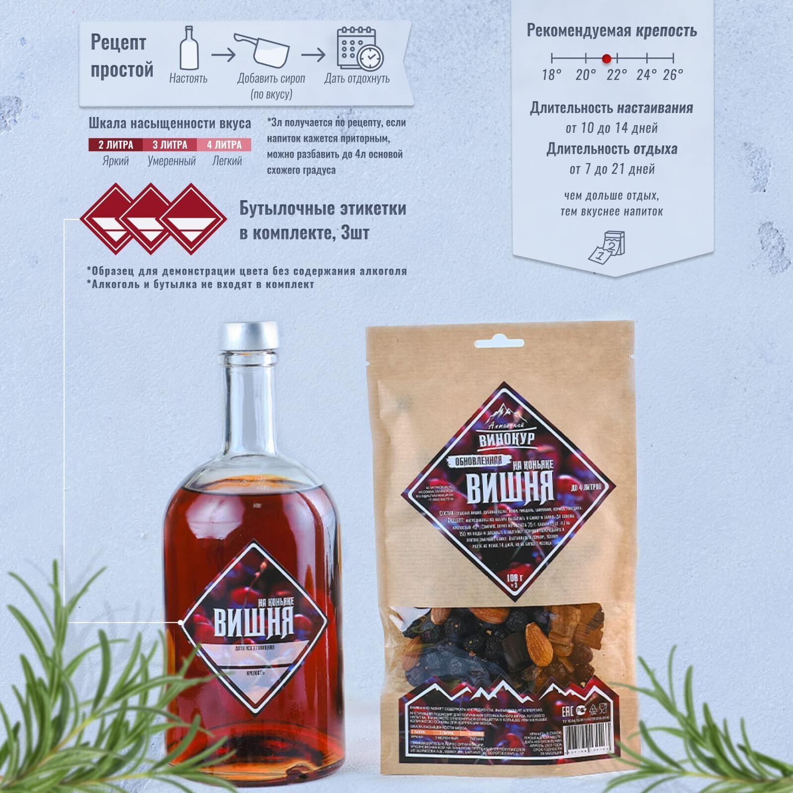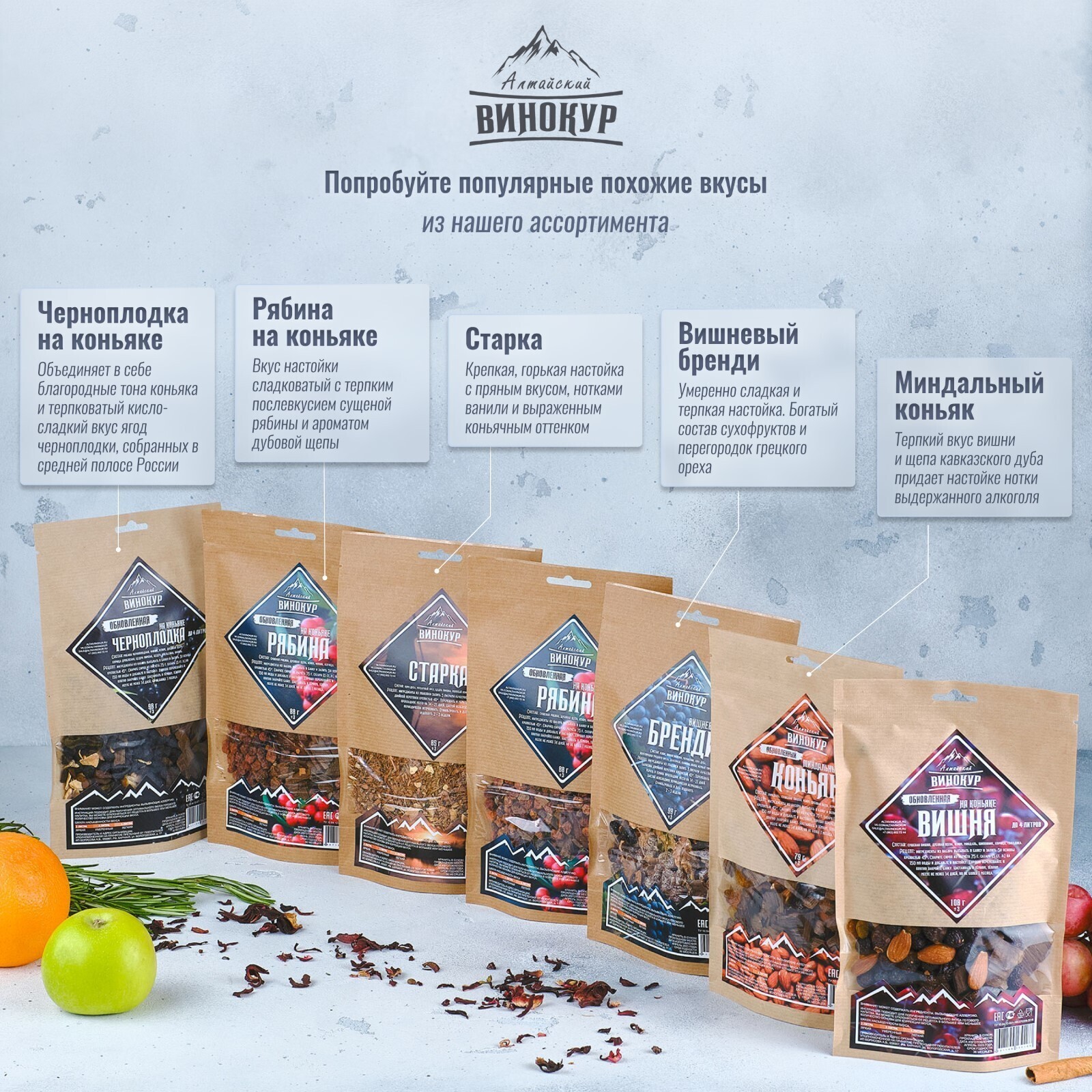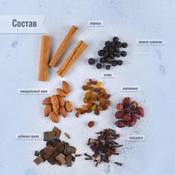 Состав : вишня вяленая, дубовые кубики средней обжарки (Кавказ), корица, миндаль, изюм, гвоздика, плоды шиповника.