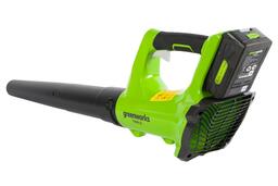 Воздуходувка аккумуляторная Greenworks G24AB из линейки устройств 24 вольт предназначается для уборки опавшей листвы, пыли, прочей грязи и мусора. Данная модель имеет аксиальное строение вентилятора, что делает возможным достижения высоких показателей скорости объема потока воздуха 160 - 177 км/ч или 8 м?/мин соответственно. Данные характеристики позволяют конкурировать с бензиновыми аналоги, но при это аккумуляторный воздуходув будет обладать рядом неоспоримых преимуществ: