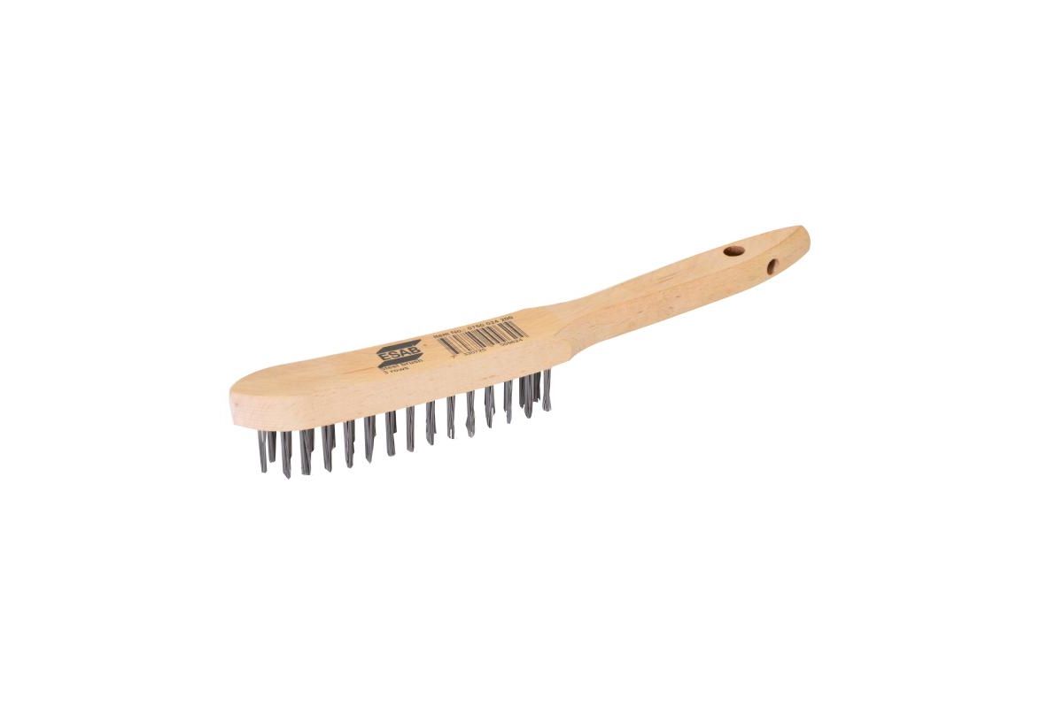 Щетка 3-х рядная стальная, ESAB обладает деревянной рукояткой и проволочной стальной щетиной. Щетка ESAB удобно располагается в руке и имеет специальное отверстие для подвеса. Проволока, располагающаяся в пять рядов, изготовлена из легированной стали для увеличения срока службы. Материал щетины сталь