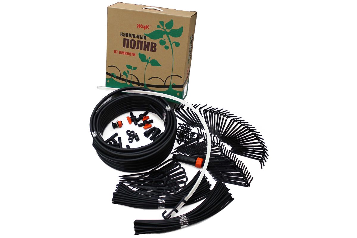 Комплектация: штуцер присоединения к ёмкости шланг магистральный 9 м трубка уровень прозрачная 1 м, подвес для трубки уровня-1 шт. шланг подающий 40см - 30 шт. ,капельницы - 30 шт. тройник малый - 15 шт., кран - 1 шт. уголок для магистрального шланга - 2 шт. тройник большой - 2 шт.заглушка для магистрального шланга - 2 шт. прижим для магистрального шланга -18 шт. шило для магистрального шланга - 1 шт. штуцер 1/2'' ( для соединения с ёмкостью) - 1 шт. , штуцер 3/4(для монтажа фильтра)-2 шт. фильтр тонкой очистки - 1 шт.В комплект для капельного полива ТМ ''Жук'' входит штуцер присоединения к ёмкости, которого у других производителей нет.Все шланги в комплекте выполнены из чёрного полиэтилена, что предотвращает зацветание воды в полостях шлангов;