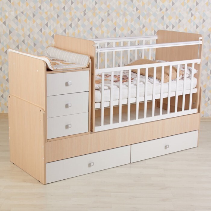 Детская кровать оснащена механизмом качания, который позволит убаюкать малыша в считанные минуты. Ортопедическое ложе будет способствовать правильному развитию ребёнка. Высота боковины не позволит малышу самостоятельно вылезти из кровати, а опускающийся бортик поможет родителям удобно укладывать и поднимать ребёнка из кроватки.