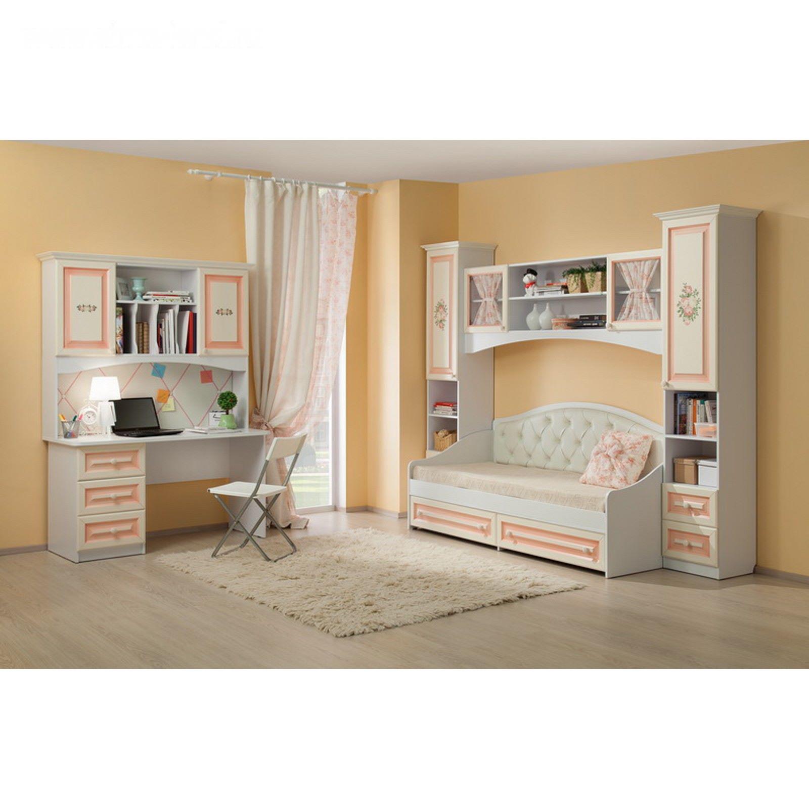 Модульная система «Алиса» подойдёт для комнаты юной девушки. Плавные и мягкие формы понравятся её обладательнице. Классическая глубокая фрезеровка на мебели, бежевая эмаль на фасадах и тонировка нежно-розовой патиной сделают комнату более уютной и элегантной.