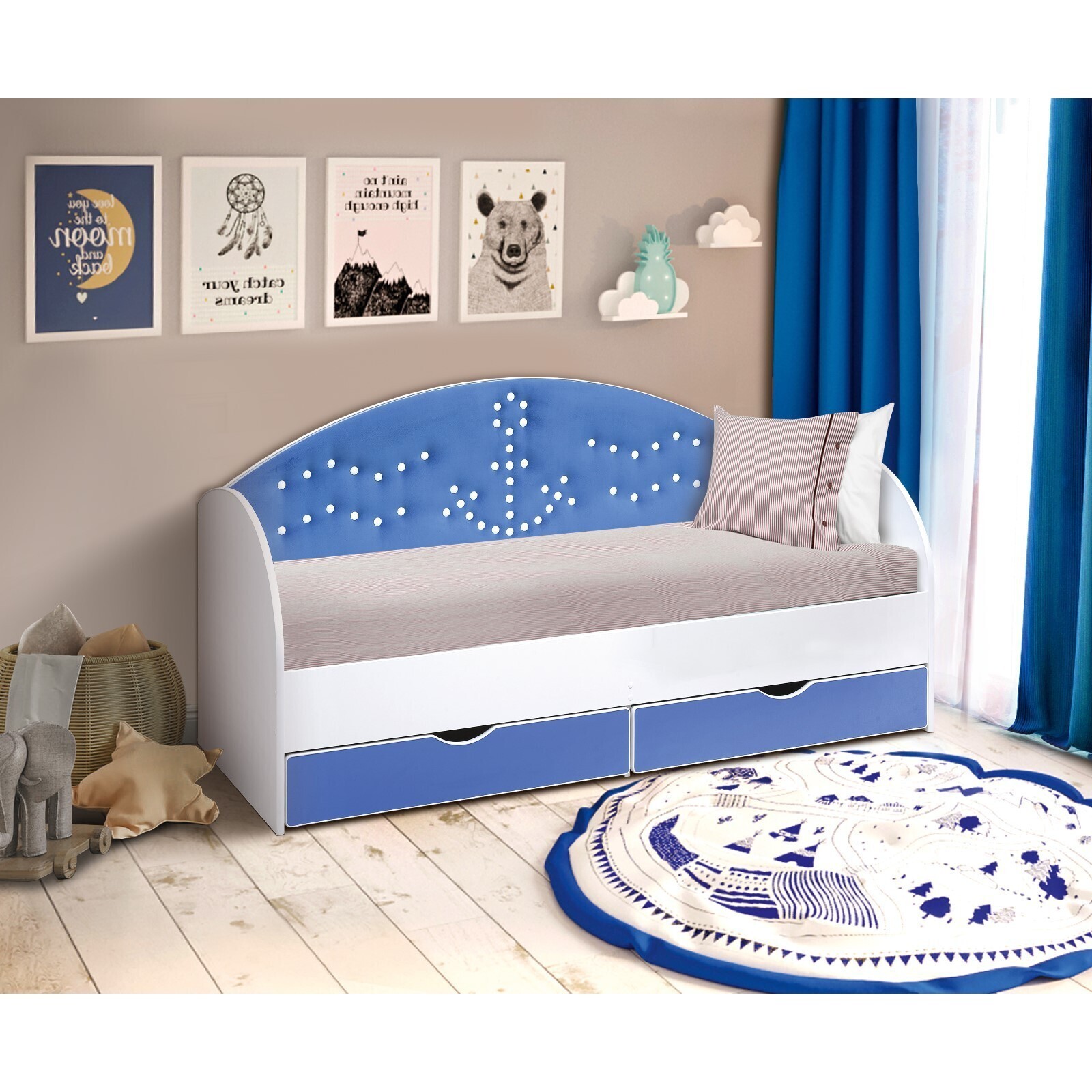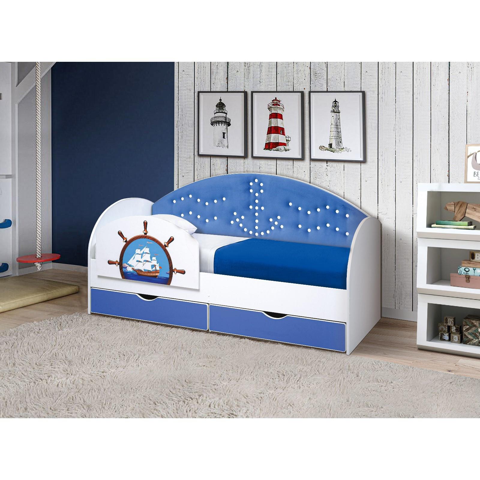 Кровать детская с мягкой спинкой «Штурвал», 800 × 1600 мм, без бортика, белый / синий