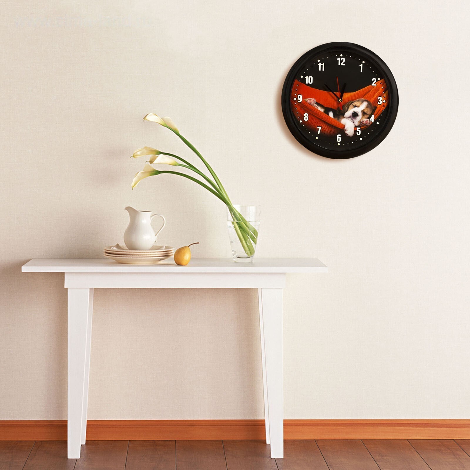 На задней стороне корпуса часов есть отверстие для подвешивания, работают от 1 батарейки типа АА (в комплект не входит).