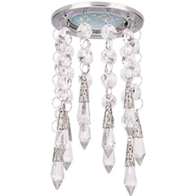 Потолочный светильник с хрусталиками выполнен в виде уменьшенного и облегченного аналога хрустальной люстры. Материал корпуса нержавеющая сталь и хрусталь. Тип лампы MR16.