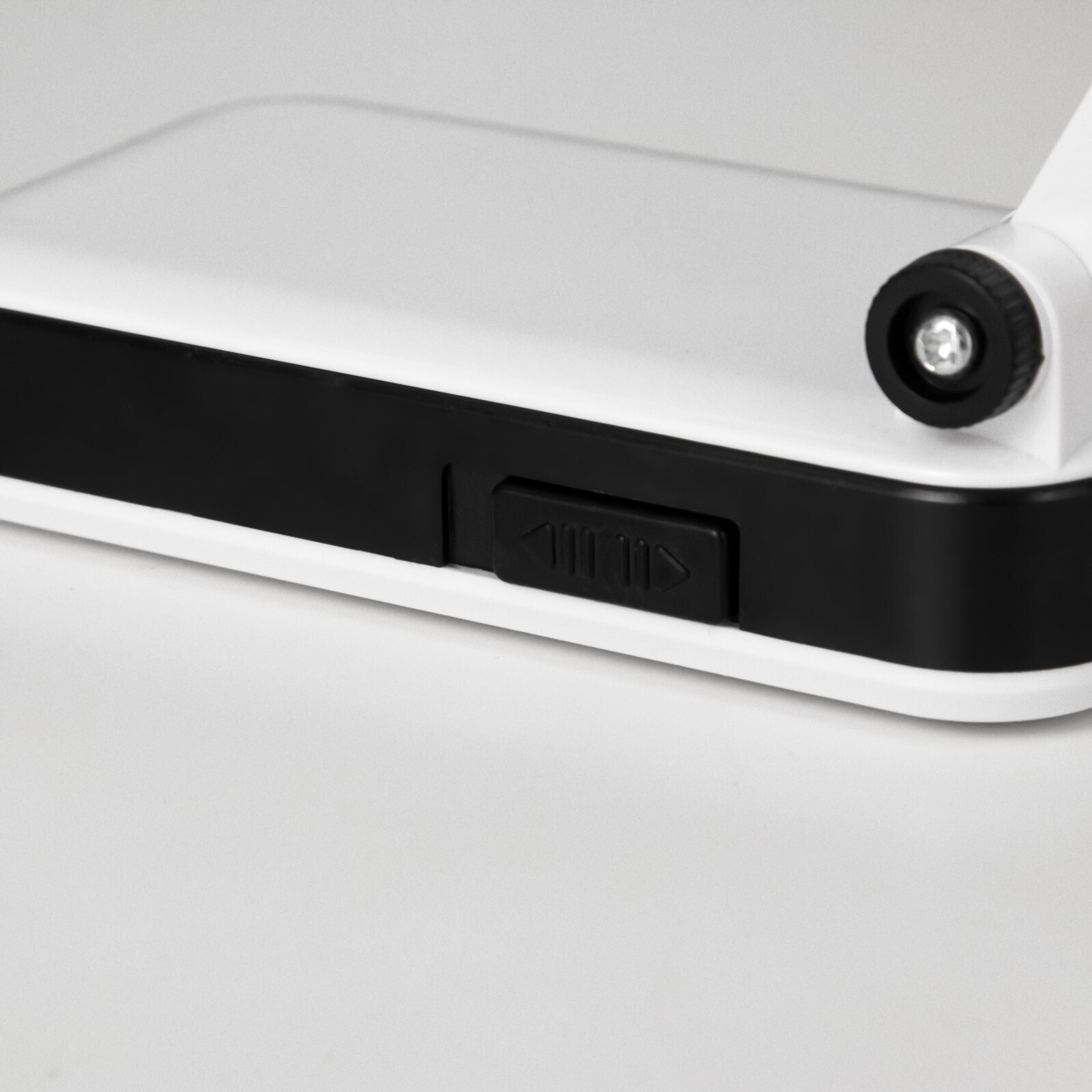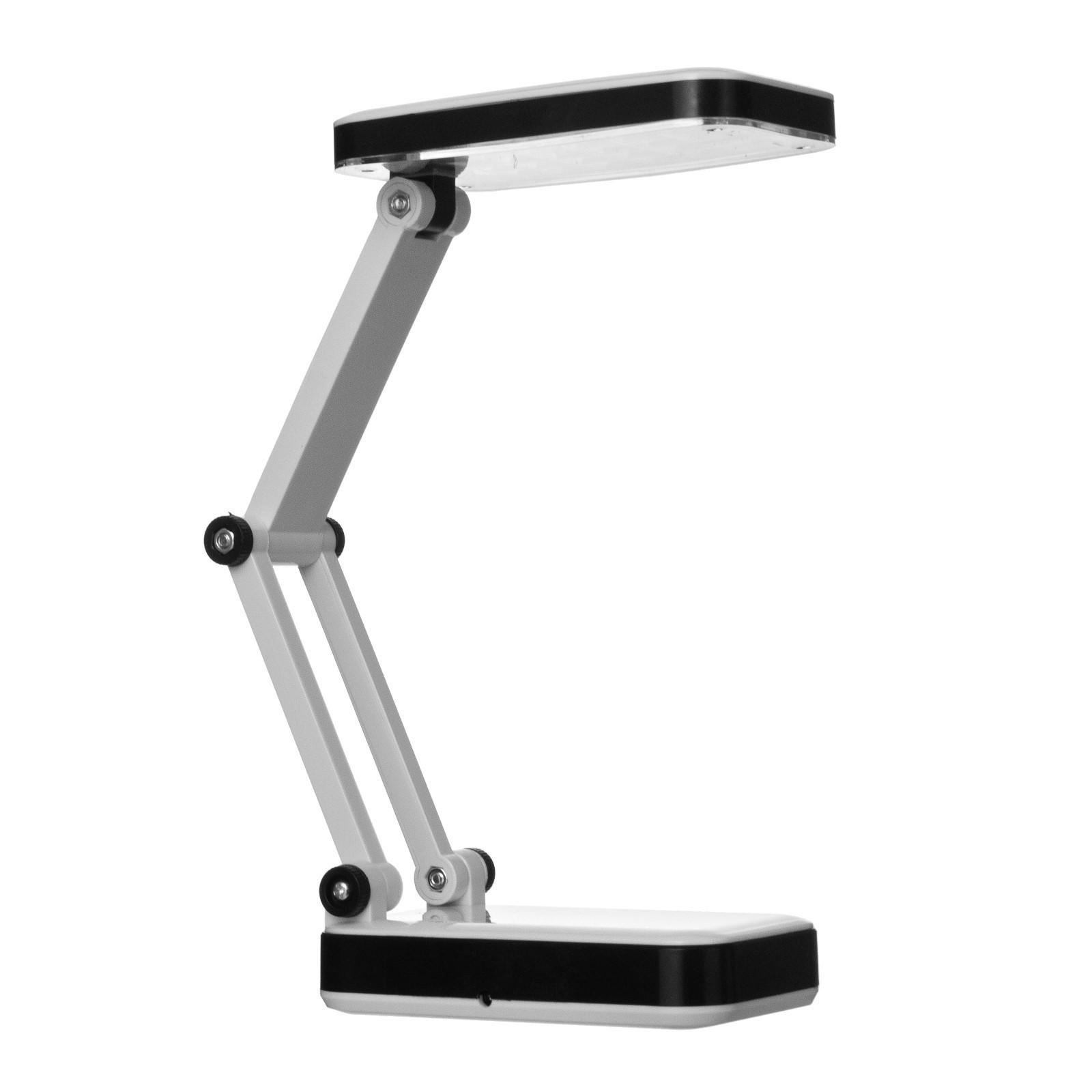 Компактный мобильный светильник имеет подвижные части корпуса, которые складываются и раскладываются. Плафон поднимается и опускается на достаточную для глаз высоту.