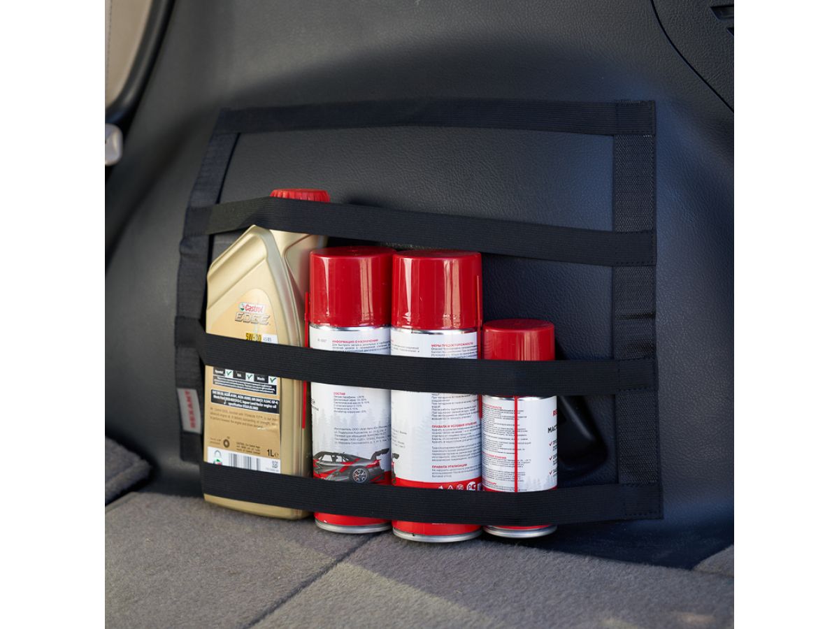 Карман надежно прикрепляется к ворсовому покрытию багажника при помощи липучки и предназначен для фиксации различного рода предметов, таких как огнетушители малых объемов, баллоны с автохимией, браслеты противоскольжения, аптечки, перчатки, салфетки и т. п.