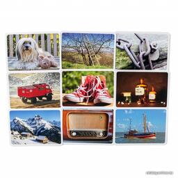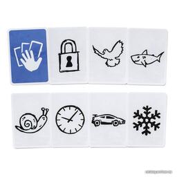 Комплектация• 91 двухсторонняя картинка• 19 карт с символами• 56 жетонов• рамка для кубиков• 4 жетона низа (с логотипом)• 24 цветных деревянных куба• 4 палочки и 4 камня• 2 шнурка (длинный и короткий)• 6 деревянных блоков разной формы• мешочек для жетонов• блокнот для подсчёта очков• правила