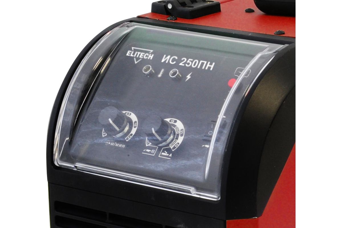 Экран из прозрачного пластика защищает органы управления от повреждения, пыли и влаги. Возможность работы при сетевом напряжении 160-240 В существенно расширяет сферу применения полуавтомата.
