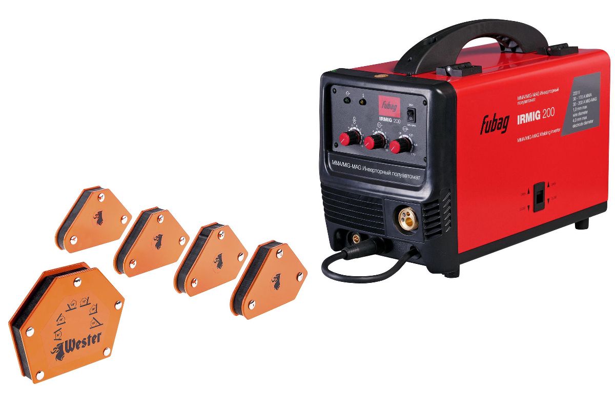 В состав набора входят: Сварочный полуавтомат FUBAG IRMIG 200 38609 + горелка FB 250 3 м инвертор, Уголки магнитные для сварки WESTER MCS (4 шт.) 829-001, углы 45°, 90°, 135°, 5кг, Уголок магнитный для сварки WESTER WMCT50 829-006, углы 30°, 45°, 60°, 75°, 90°, 135°, 23кг