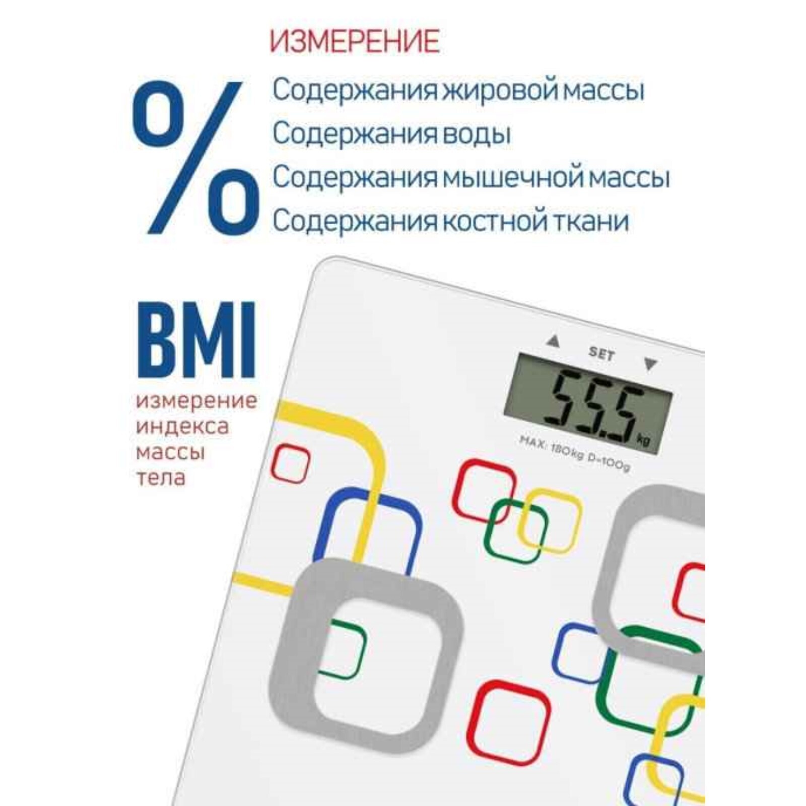 • Измерение Вес, Жировая масса, Костная масса, Мышечная масса, Содержание воды