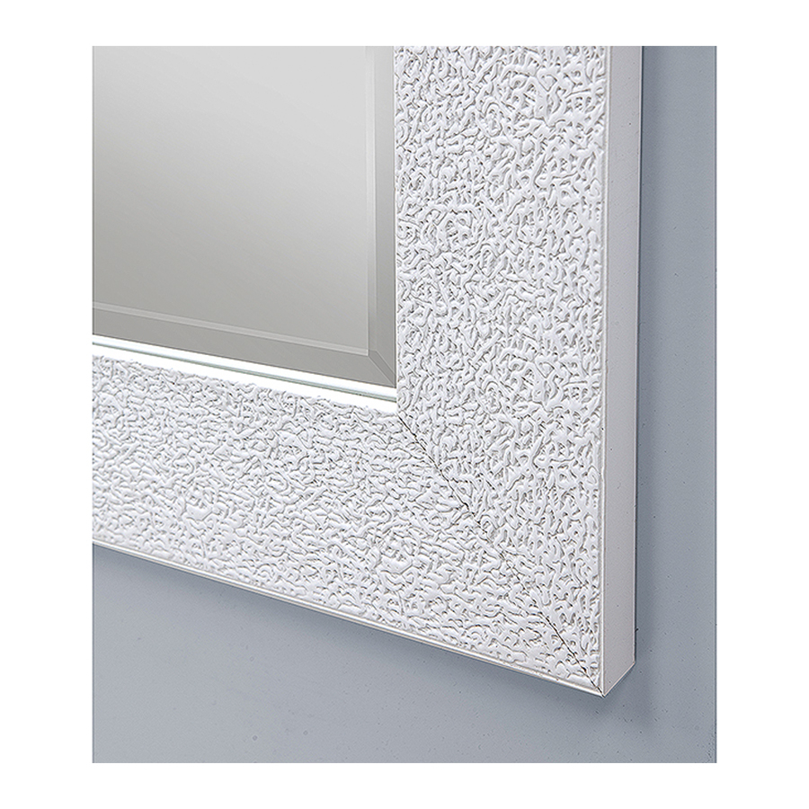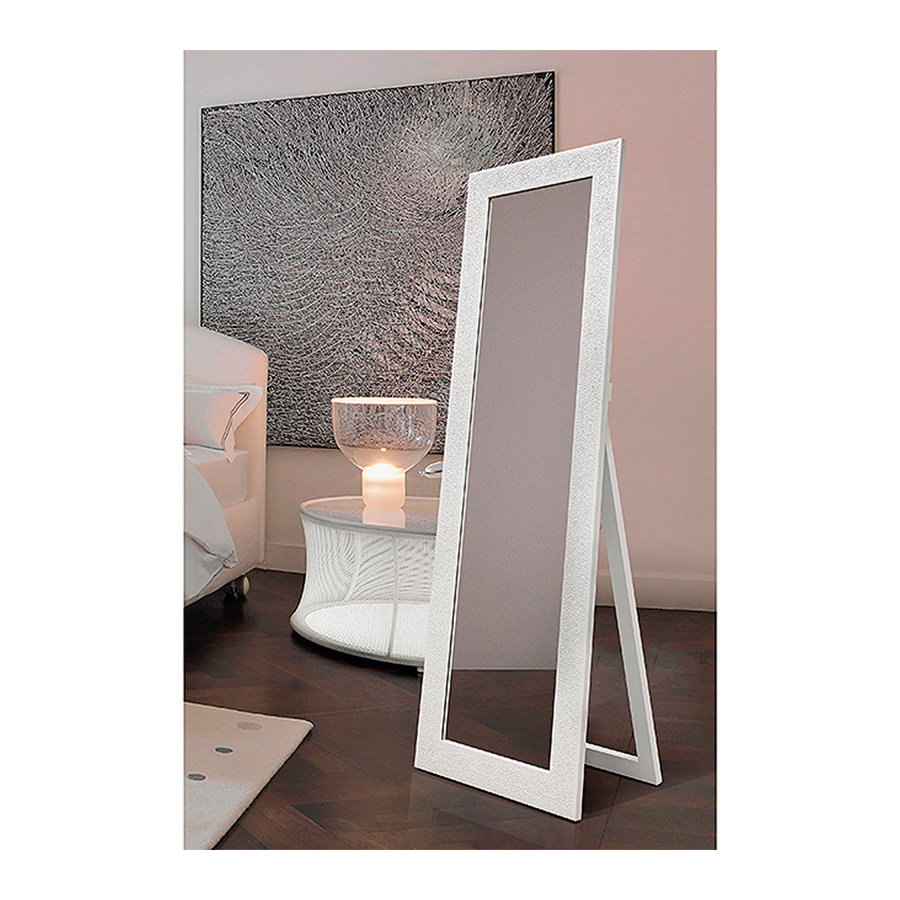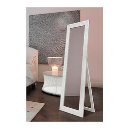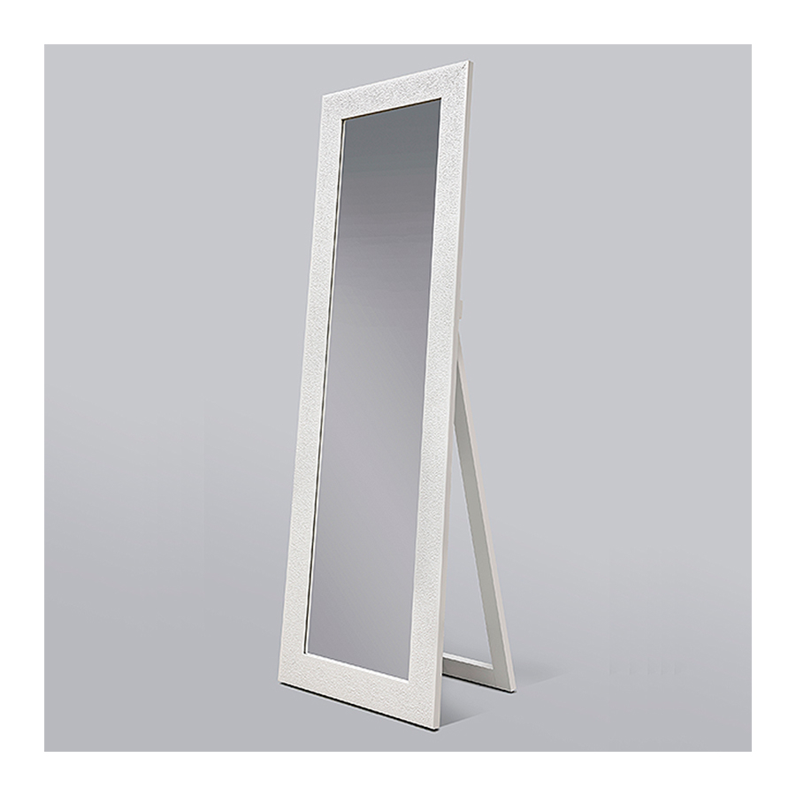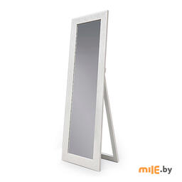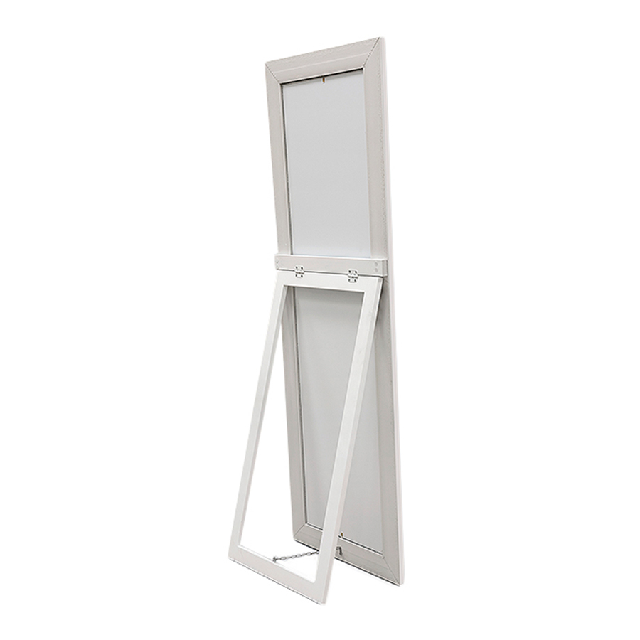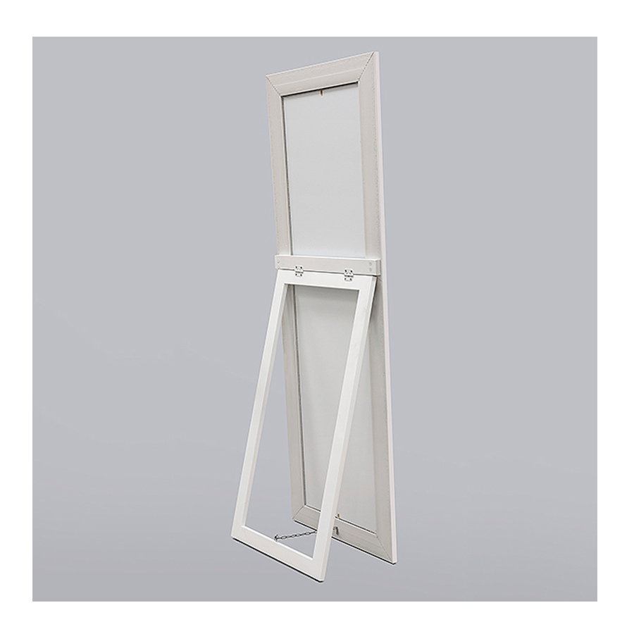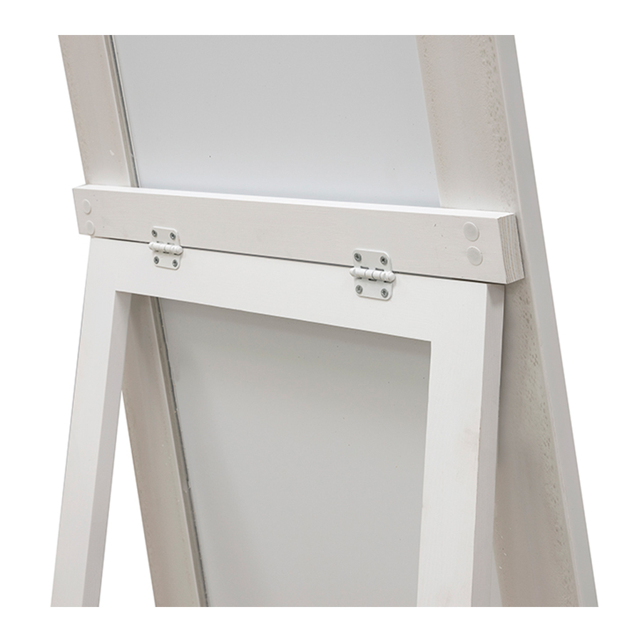 Обработка: багетная рама, цвет багета - белый, материал багета - пластик, силиконовые прокладки для защиты пола; с обратной стороны устойчивая деревянная опора, регулировка наклона зеркала в помощью цепочки.