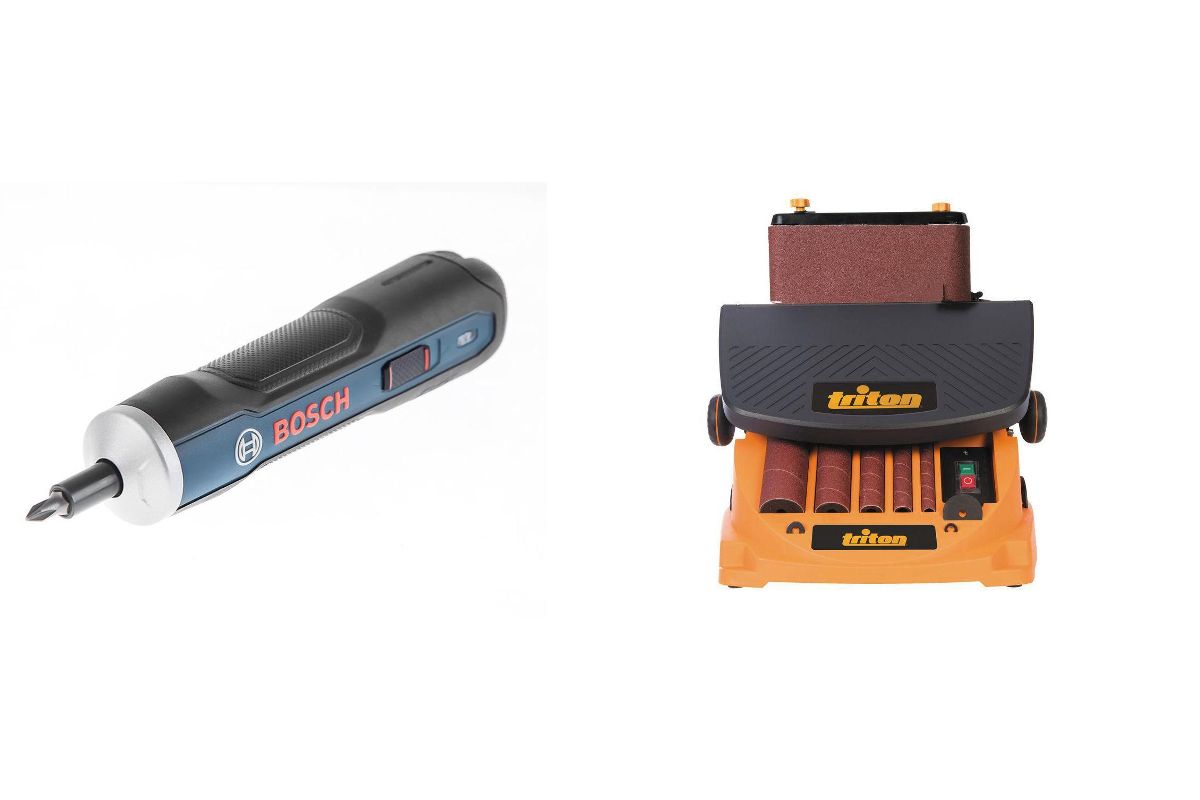В состав набора входят: Осцилляционный шпиндельно-ленточный шлифовальный станок TRITON TSPST450 TR894303, Аккум.отвертка BOSCH GO (0.601.9H2.021) 3,6В 1,5Ач 5Нм 360об/мин