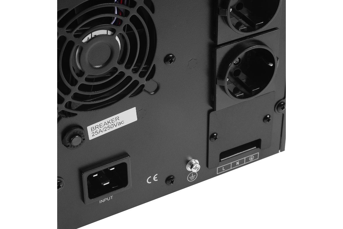 POWERMAN ONLINE 3000 построен по схеме двойного преобразования энергии, которая не требует переключения питания сеть/батарея. Форма выходного напряжения - ВСЕГДА синусоидальная. Благодаря используемой технологии преобразования энергии достигается широкий диапазон напряжений сети (115В-295В), при работе в котором не используется энергия аккумуляторов, что обеспечивает длительный срок их службы.