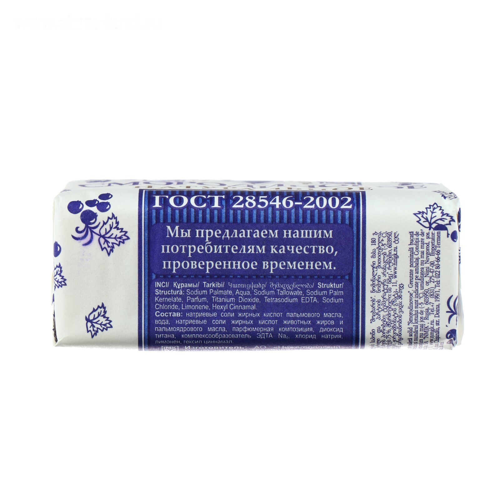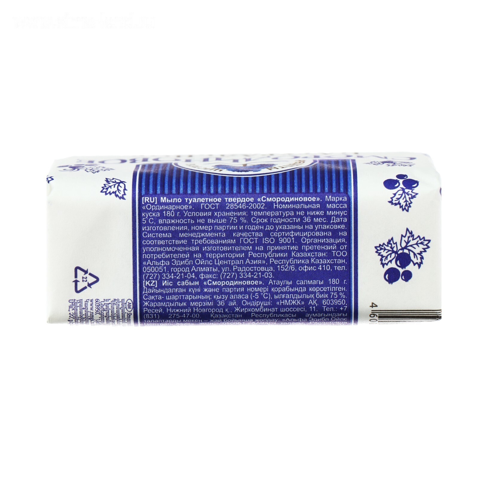 Описание: мыло туалетное "Смородиновое" в цветной обертке, 90 г. Состав: натриевые соли жирных кислот, натуральных жирова и масел, вода, глицерин, двуокись титана, парфюмерная композиция.