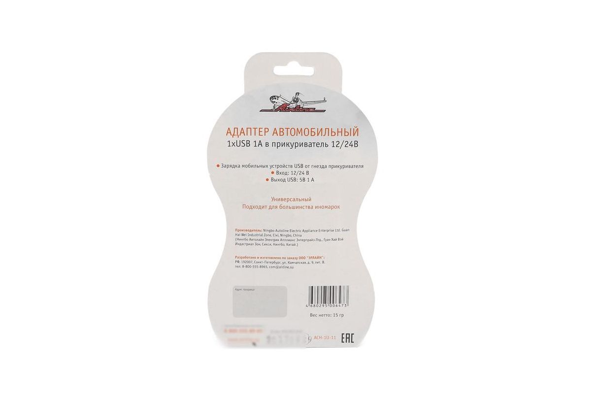 Адаптер автомобильный AIRLINE ACH-1U-11 1хUSB 1А в прикуриватель 12/24В