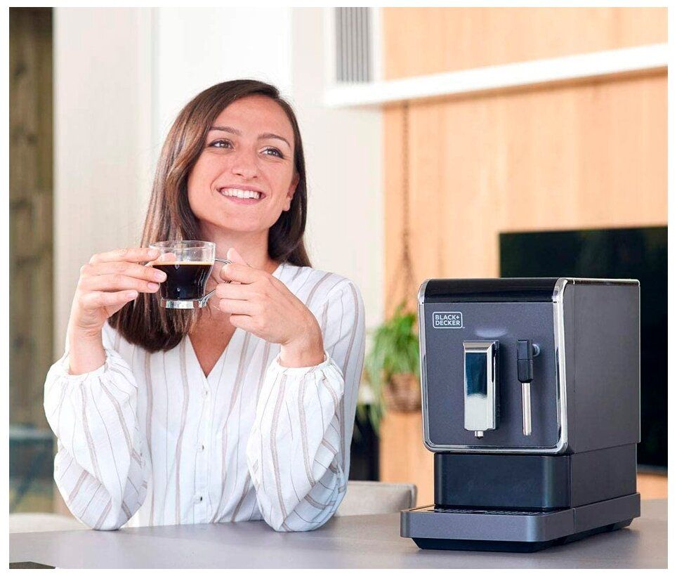 Автоматическая кофемашина Black+Decker BXCO1470E гармонично впишется в интерьер. Панель управления сенсорная. Для вспенивания молока есть ручной капучинатор. Крепость кофе и объем порции можно регулировать по своему вкусу. Диспенсер настраивается по высоте под чашки разного размера.