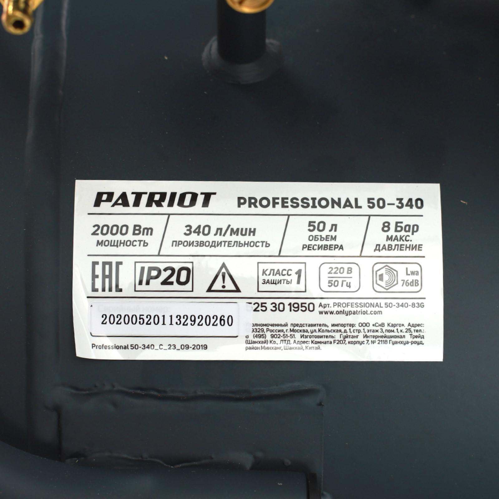 Компрессор Patriot масляный Professional50-340, 2000 Вт, 340 л/мин, 8 бар, 50 л, "елочка"