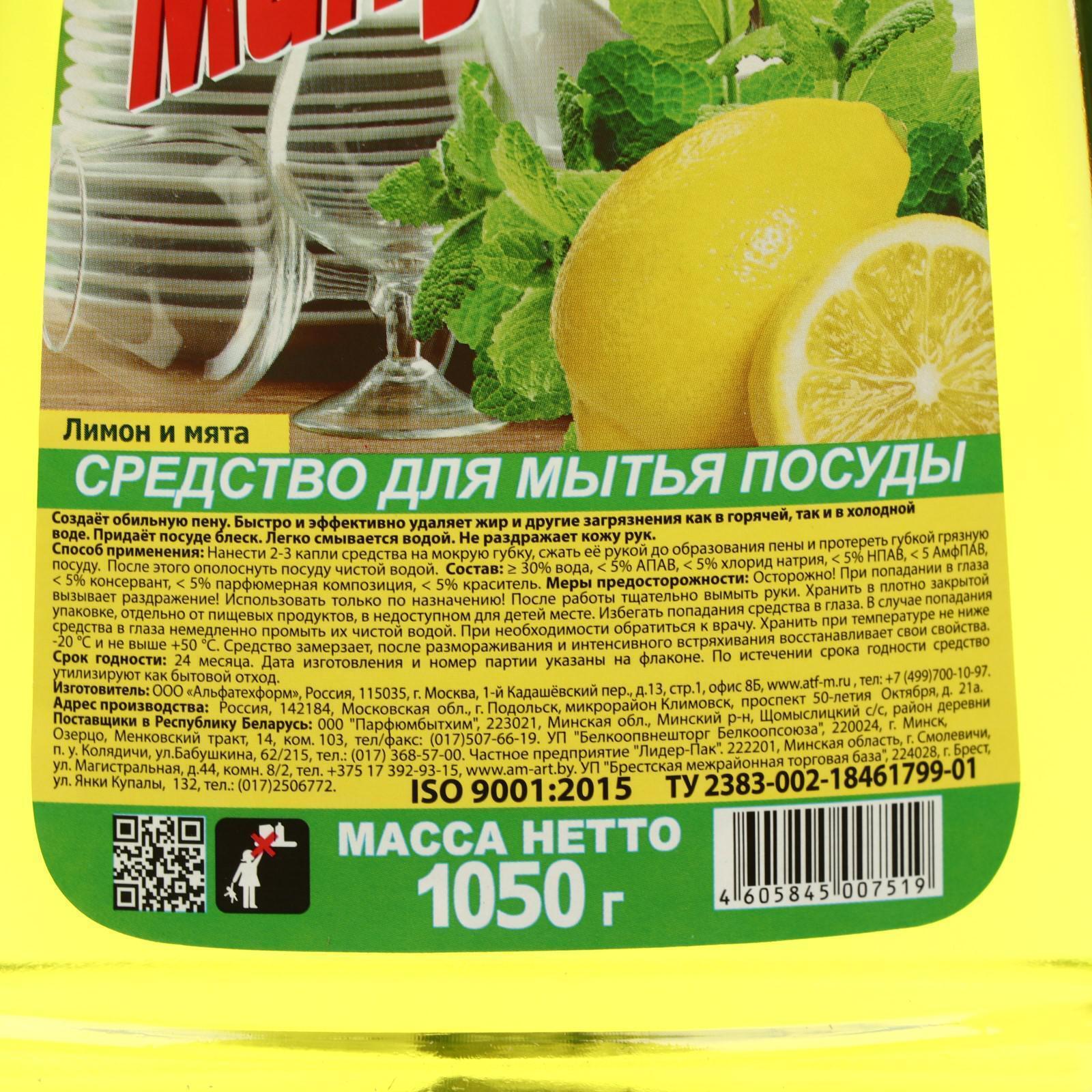 Средство для мытья посуды "Минута - Лимон и мята", 1 л
