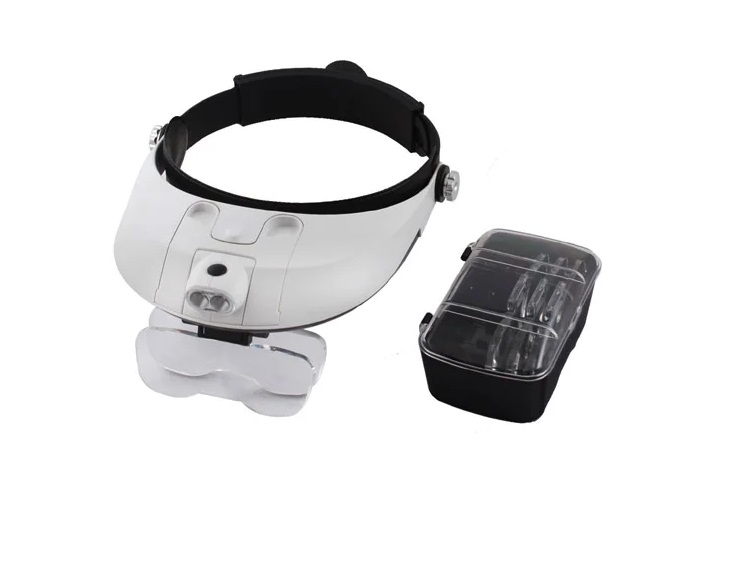 Лупа налобная со сменными пластиковыми стеклами-насадками и удобным фиксатором-обручем на голове. Увеличение: 1.5X, 1.8X, 2.5X, 3.5X. 4 сменных пластиковых стекла-насадки в комплекте. Светодиодная подсветка (1 супер яркий светодиод) позволяет работать в условиях недостаточной освещенности. Подобная налобная лупа незаменима для слабовидящих людей при чтении, работе с мелкими предметами. Лупа позволяет не занимать руки и рассматривать предметы на разной кратности (сменные линзы). Сферы применения такой лупы обширны: чтение, радиотехнические и ювелирные работы, часовые работы, медицина.