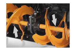 - Снег подается под кожух шнеком и затем выбрасывается крыльчаткой через раструб снегоотбрасывателя;