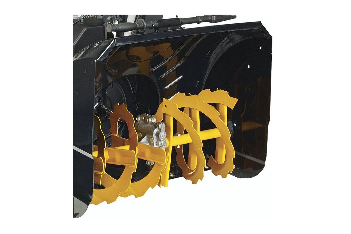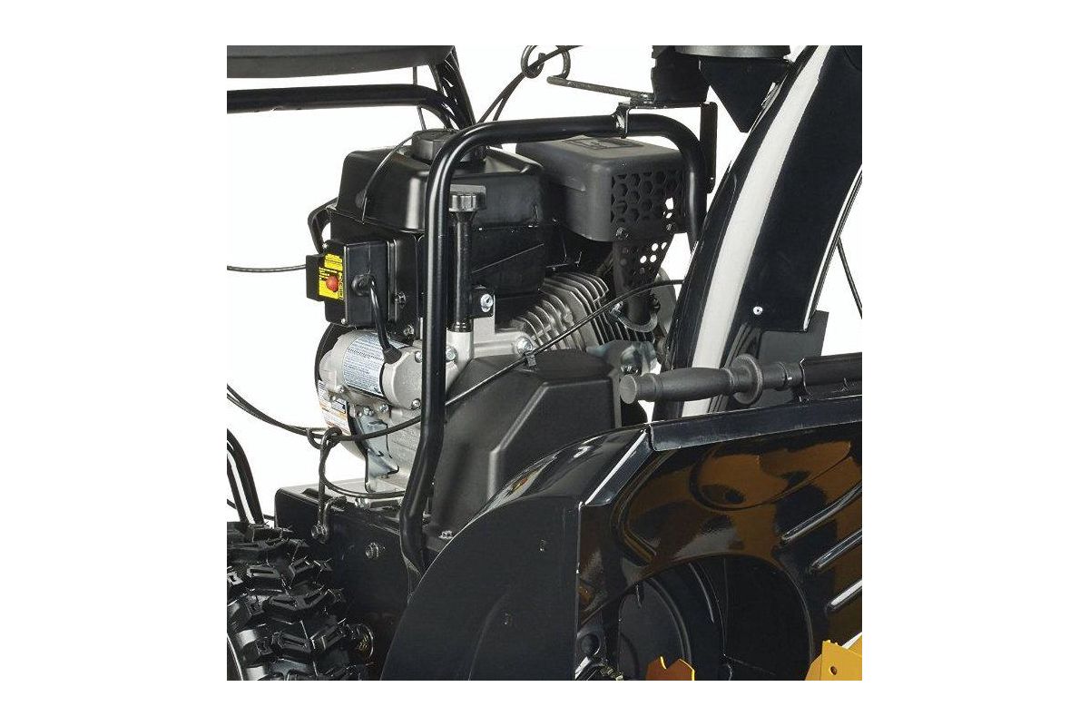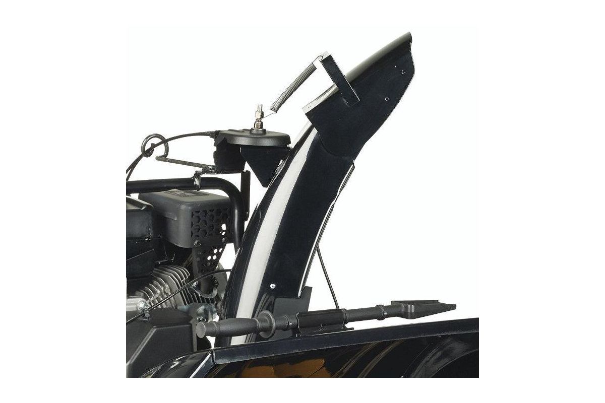 - Поворотный стальной патрубок выброса снега, регулировка направления и дальности выброса снега с помощью джойстика, самоходный, скорости движения - 6 вперед, 2 назад, курки - для разблокировки дифференциала;
