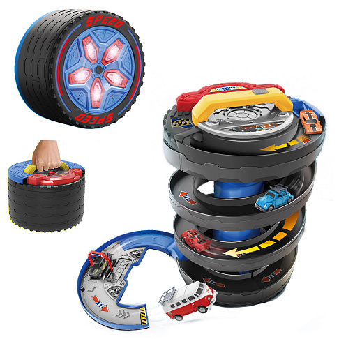 Игровой набор "Гоночный трек. Колесо" - это необычная игрушка, которая станет прекрасным подарком для юного автолюбителя. Игрушка выполнена в виде колеса, которое раскрывшись превращается в круговой трек. В набор входят две машинки, которые можно запускать по треку. Световые и звуковые эффекты, которыми оснащена игрушка, сделают игру с ней ещё динамичнее и веселее.